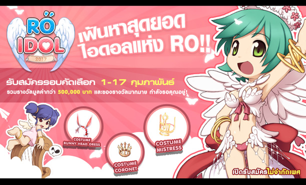 หากคุณเป็นชาว Ragnarok ที่เปี่ยมไปด้วยความมั่นใจและกล้าแสดงออก เวทีนี้กำลังส่องแสงเพื่อคุณ!! ไม่ว่าจะเป็นสาวๆ หนุ่มๆ หรือแม้แต่สาวประเภทสอง ก็สามารถกลายเป็นไอดอลแห่งโลก Ragnarok ได้ง่ายๆ นอกจากได้รับตำแหน่งการันตีแล้ว ผู้เข้ารอบ 10 คนสุดท้าย ยังจะได้รับรางวัลเงินสด, Free Kafra Point และหมวกคอสตูมสุดแรร์รวมมูลค่ากว่า 500,000 บาท!!! เตรียมกรอกใบสมัครพร้อมกันวันที่ 1-17 กุมภาพันธ์นี้