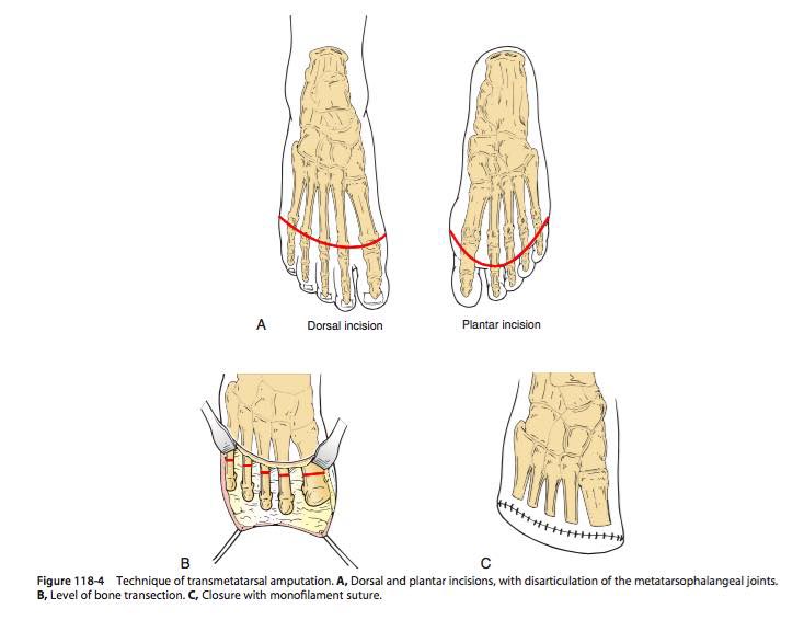 แต่ถ้ามีภาวะติดเชื้อรุนแรงอาจจำเป็นต้องตัดสูงขึ้นไปอีกเพื่อให้แน่ใจว่าภาวะติดเชื้อโดนกำจัดไปมากที่สุดในขณะที่ต้องเหลือส่วนขาให้ยาวที่สุดไปพร้อมพร้อมกัน