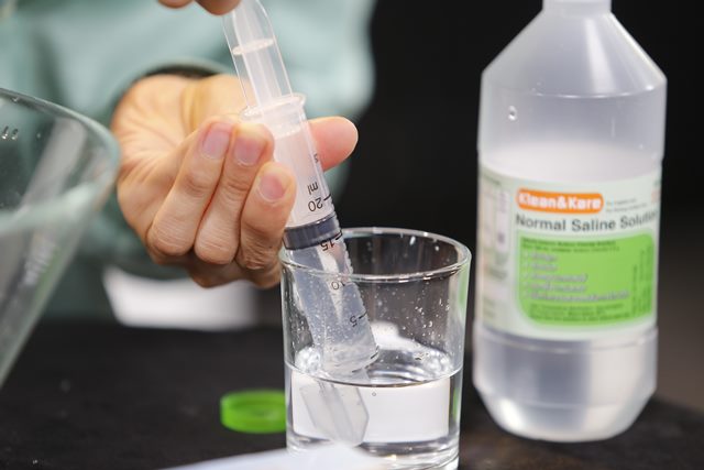 - เทน้ำเกลือใส่ภาชนะ แล้วใช้ไซริงค์ดูดน้ำเกลือขึ้นจากภาชนะ กะปริมาณตามสมควร