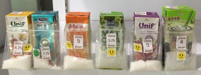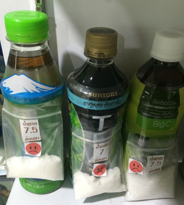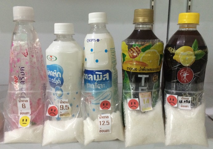 “ในประเด็นเครื่องดื่มเรากังวลเรื่องน้ำตาล เพราะใน 1 วัน เราไม่ควรบริโภคน้ำตาลเกิน 6 ช้อนชา หรือ 24 กรัม แต่จากปริมาณน้ำตาลที่มีอยู่ในขวดเครื่องดื่มที่เห็น จะพบว่าเครื่องดื่มบางชนิดเพียง 1 ขวดก็เกินปริมาณความต้องการน้ำตาลของร่างกายต่อวันแล้ว นี่ยังไม่รวมกับการบริโภคอาหารและเครื่องดื่มอื่นๆ ที่มีน้ำตาลเป็นส่วนประกอบอีก”