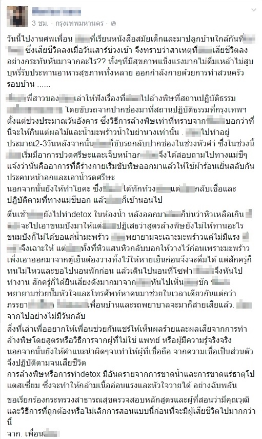 เมื่อวันที่ 21 มีนาคม บนเฟสบุ๊คมีการเเชร์เรื่องราวของหญิงสาวคนหนึ่งที่ไปล้างพิษ หรือทำดีท็อกซ์ที่สถานปฏิบัติธรรมแห่งหนึ่งจนเสียชีวิต พร้อมระบุด้วยว่า การล้างพิษหรือการดีท็อกซ์ มีอันตรายจากการขาดน้ำและการขาดแร่ธาตุ ซึ่งจะทำให้กล้ามเนื้ออ่อนแรงและหัวใจวายได้ อย่างฉับพลัน เเละได้เรียกร้องให้ กระทรวงสาธารณสุขตรวจสอบหลักสูตรและผู้ที่สอนว่ามีคุณวุฒิและวิธีการที่ถูกต้องก่อนที่จะมีผู้เสียชีวิตไปมากกว่านี้