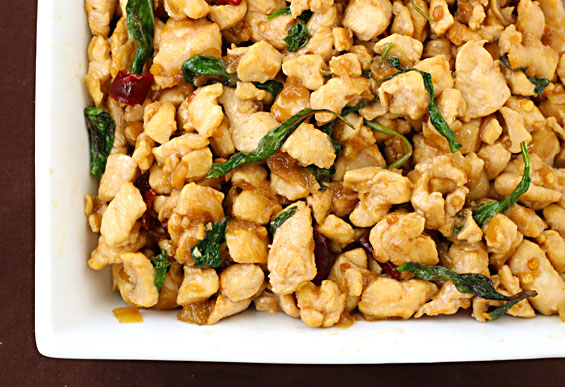 - หรี่ไฟอ่อนๆ และปรุงรสด้วยน้ำปลา น้ำมันหอย (2 ช้อนโต๊ะต่ออกไก่ 100 กรัม) ปิดท้ายด้วยน้ำตาล