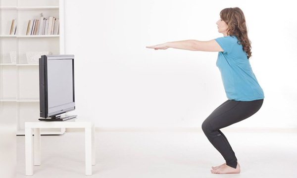 1.ท่าลุกนั่ง แยกเท้าทั้ง 2 ข้างออกเล็กน้อย ยื่นแขนออกมาให้ขนานกับลำตัว ย่อตัวลงไป และยืดกลับท่าเดิม ทำอย่างน้อย 10-15 ครั้ง ท่านี้สามารถทำได้ขณะดูทีวี หรือแม้แต่ขณะอยู่ในห้องน้ำ เพื่อเสริมสร้างความแข็งแรงให้กับกล้ามเนื้อส่วนล่าง และลดต้นขาได้ด้วย