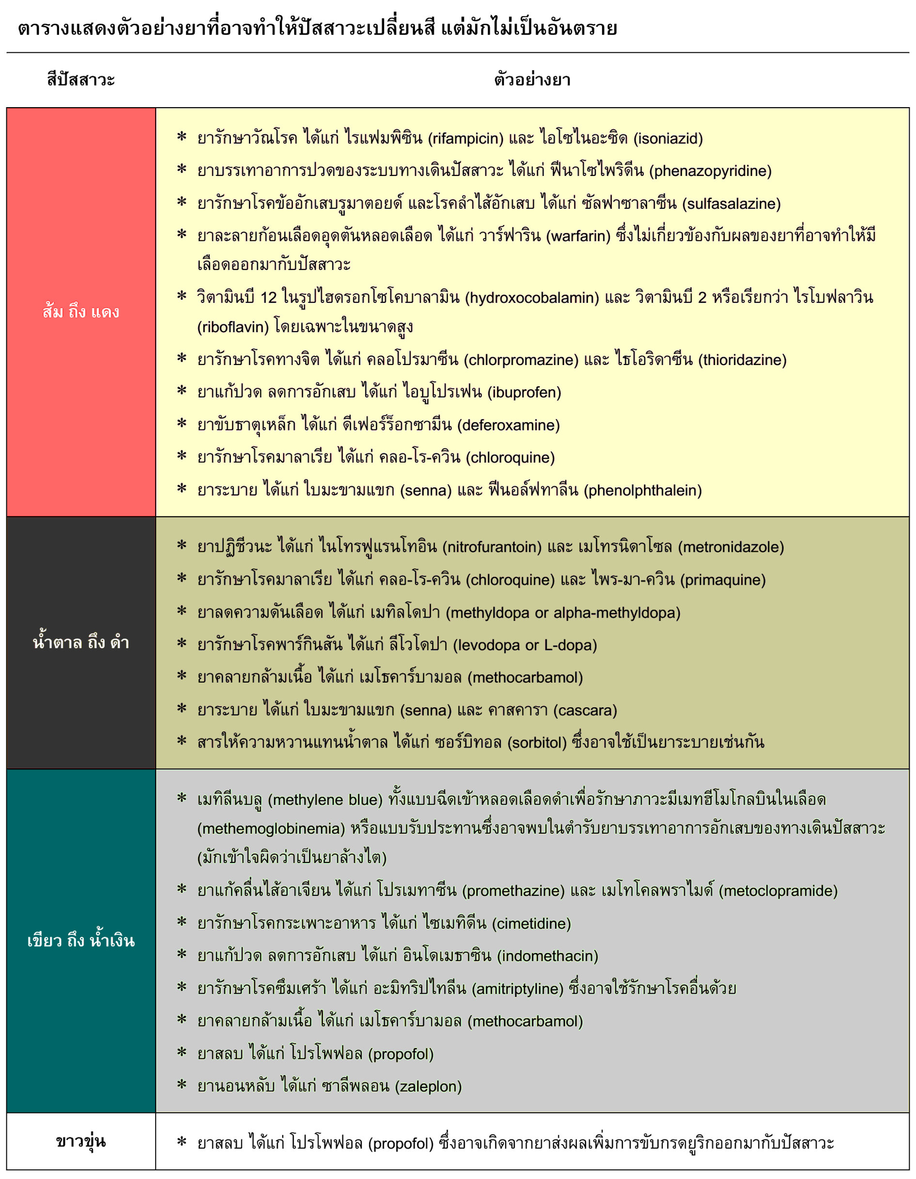การเปลี่ยนสีของปัสสาวะจากยานั้น มักไม่ก่อให้เกิดอันตราย และส่วนใหญ่เกิดจากสีของยาหรือสารที่เกิดขึ้นจากการที่ร่างกายเปลี่ยนแปลงยา โดยอาจพบได้หลายสี เช่น สีส้ม-ชมพู-แดง หรือ สีน้ำตาล-ดำ หรือ สีเขียว-น้ำเงิน หรือ สีขาวขุ่น ดังแสดงในตาราง ทั้งนี้ ขึ้นกับชนิดของยา แต่บางครั้ง แม้เป็นยาชนิดเดียวกันก็อาจทำให้เกิดการเปลี่ยนสีของปัสสาวะได้แตกต่างกันในแต่ละคน เนื่องจากมีปัจจัยส่งเสริมอื่นๆ เช่น ปริมาณยาที่ได้รับ (ปริมาณยามากอาจทำให้มีสีเข้มมาก) ปริมาณและสีเดิมของปัสสาวะ (เหลืองอ่อนหรือเข้ม ซึ่งจะผสมกับสีของยาแล้วได้สีใหม่) สภาวะความเป็นกรด-ด่าง ของปัสสาวะ โรคหรือภาวะเดิมที่ผู้ป่วยเป็นอยู่ และยาอื่นที่ผู้ป่วยใช้ร่วม เป็นต้น