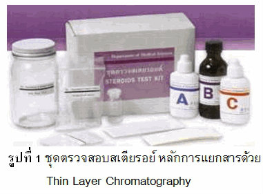 นอกจากชุดทดสอบที่ได้กล่าวมาแล้วข้างต้น การตรวจสอบการปนปลอมยาสเตียรอยด์ เด็กซ์ซาเมทาโซน และเพร็ดนิโซโลน ในตัวอย่างผลิตภัณฑ์สมุนไพรจำนวนมาก สามารถใช้ “วิธีรงคเลขผิวบาง (Thin layer chromatography, TLC)” ซึ่งเป็นวิธีที่ง่าย สะดวก ตรวจสอบได้หลาย ๆ ตัวอย่างในเวลาเดียวกัน วิธีนี้เป็นวิธีที่ห้องปฏิบัติการในมหาวิทยาลัยต่าง ๆ ใช้ในการวิเคราะห์เชิงคุณภาพและปริมาณของวัตถุดิบสมุนไพร และผลิตภัณฑ์สมุนไพร วิธี TLC มีหลักการคือ การแยกสารตามหลักการโครมาโทกราฟี ที่มีวัฏภาคคงที่ และวัฏภาคเคลื่อนที่ หลังจากนั้นจะตรวจสอบสารด้วยน้ำยาพ่นเฉพาะ ในกรณีการตรวจสอบการปนปลอมยาสเตียรอยด์ เดกซ์ซาเมธาโซน และเพร็ดนิโซโลน ระบบ TLC ที่จะแนะนำ คือ วัฏภาคคงที่ Silica gel GF254 ส่วนวัฏภาคเคลื่อนที่ อาจจะเป็น dichloromethane : methanol อัตราส่วน 9:1 หรือ toluene : ethyl acetate : formic acid อัตราส่วน 50:45:10 น้ำยาพ่นที่ใช้คือ tetrazolium blue ซึ่งถ้ามีการปนปลอมสเตียรอยด์ จะเกิดเป็นแถบสีม่วงน้ำเงิน ในระยะเดียวกับสเตียรอยด์ที่ใช้เป็นสารเปรียบเทียบ โดยทั่วไปสมุนไพรมักจะมีสารกลุ่มสเตียรอยด์ที่พืชสร้างขึ้นมาเอง เช่น beta-sitosterol, stigmasterol, campesterol แต่สารดังกล่าวจะมีค่า Rf ที่มากกว่ายาสเตียรอยด์สังเคราะห์ เนื่องจากมีขั้วน้อยกว่า และจะไม่ให้ผลบวกกับน้ำยาพ่น tetrazolium blue เป็นสีม่วงน้ำเงิน บางครั้งผลของทีแอลซีโครมาโทแกรมของตัวอย่างที่นำมาตรวจสอบอาจจะมีแถบสารที่มีค่า Rf เท่ากับหรือใกล้เคียงกับยาสเตียรอยด์เมื่อตรวจสอบภายใต้แสงอัลตราไวโอเลตที่ความยาวคลื่น 254 นาโนเมตร แต่ถ้าพ่นด้วยน้ำยาพ่นแล้วไม่ให้สีม่วงน้ำเงิน แสดงว่าตัวอย่างดังกล่าวไม่มียาสเตียรอยด์ ทั้งนี้เพราะตัวอย่างดังกล่าวอาจจะมีสารอื่นที่มีขั้วใกล้เคียงกับยาสเตียรอยด์ แต่ถ้าตัวอย่างยาลูกกลอนที่นำมาตรวจสอบมีน้ำตาลเป็นส่วนผสม ผลของโครมาโทแกรมที่พ่นด้วยน้ำยา tetrazolium blue จะพบว่ามีแถบที่ให้ผลบวกเป็นสีม่วงน้ำเงินใกล้จุดเริ่มต้น ทั้งนี้เนื่องจากน้ำยาพ่น tetrazolium blue ให้ผลบวกกับสารกลุ่มน้ำตาลด้วย ซึ่งถ้านำตัวอย่างลูกกลอนที่มีน้ำตาลเป็นส่วนผสม มาตรวจสอบกับน้ำยาพ่นโดยตรงโดยไม่มีการแยกสารตามวิธี TLC จะพบผลบวกลวง ฉะนั้นจึงถือได้ว่า วิธี TLC เป็นวิธีที่ใช้ตรวจสอบการปนปลอมด้วยยาสเตียรอยด์ได้อย่างมีประสิทธิภาพ ประหยัด และรวดเร็ว3 (รูปที่ 3)