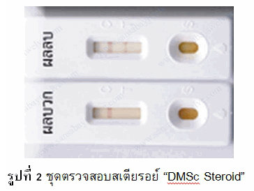ทั้งนี้เนื่องจากชุดทดสอบแบบเดิม มีขั้นตอนการเตรียมตัวอย่างหลายขั้นตอน ต้องใช้เครื่องมือพิเศษ และผู้ชำนาญการในการทดสอบและอ่านผล ทำให้ยุ่งยาก เสียเวลา ปัจจุบันกรมวิทยาศาสตร์การแพทย์จึงได้ทำการพัฒนาวิธีการตรวจให้ง่ายขึ้น สามารถนำไปใช้ในภาคสนาม และประชาชนทั่วไปสามารถนำไปใช้ตรวจสอบได้ด้วยตัวเอง ซึ่งจะส่งผลให้การคุ้มครองผู้บริโภคทุกพื้นที่เกิดประสิทธิภาพมากขึ้น ชุดทดสอบนี้คือ “DMSc Steroid” เป็นชุดทดสอบสำหรับใช้ในการตรวจสอบเบื้องต้นสำหรับเด็กซ์ซาเมทาโซน และเพร็ดนิโซโลน ซึ่งทดสอบได้ง่ายกว่าชุดทดสอบแบบเดิม ลักษณะการตรวจเป็นแบบให้เชิงคุณภาพ โดยใช้เทคนิคอิมมูโนโครมาโทกราฟี (Immunochromatography) ปริมาณต่ำสุดที่สามารถตรวจวัดได้สำหรับเด็กซ์ซาเมทาโซน เท่ากับ 1 ไมโครกรัม/มิลลิลิตร และสำหรับ เพร็ดนิโซโลน เท่ากับ 50 ไมโครกรัม/มิลลิลิตร วิธีการตรวจสอบ มีดังนี้ คือ ถ้าตัวอย่างยาสมุนไพรเป็นยาเม็ด ให้บดให้แตกละเอียด หรือใช้กรรไกรสะอาดตัดเป็นชิ้นเล็ก ๆ ตักตัวอย่างด้วยหลอดพลาสติกสำหรับตักตัวอย่าง หรือหลอดหยดตัวอย่างที่เป็นของเหลวลงในหลอดทดสอบพลาสติก จากนั้นให้หยดน้ำยาจากขวดบรรจุน้ำยาละลายตัวอย่างลงในหลอดทดสอบที่ใส่ตัวอย่างยาสมุนไพร แล้วปิดจุกพลาสติกให้แน่น จากนั้นเขย่าให้เข้ากันประมาณ 3 นาที ตั้งทิ้งไว้จนเกิดการแยกชั้น จากนั้นดูดน้ำยาส่วนใสไม่ให้มีฟองอากาศ และหยดลงในหลุมทดสอบในลักษณะตั้งตรงทีละหยด จำนวน 4 หยด อ่านผลการทดสอบภายใน 10-15 นาที แล้วสังเกตผล โดยหากพบว่า เป็นเส้นสีแดง 2 เส้น แสดงว่า ไม่มีการปนปลอมของยาสเตียรอยด์ในยาสมุนไพรที่ทดสอบ แต่ถ้าเห็นเป็นเส้นสีแดง 1 เส้น แสดงว่า มีการปนปลอมของสารสเตียรอยด์2 (รูปที่ 2) ชุดทดสอบนี้หาซื้อและสอบถามได้ที่ ศูนย์ชุดทดสอบและผลิตภัณฑ์ ของกรมวิทยาศาสตร์การแพทย์ โทรศัพท์ 0-2951-0000 ต่อ 98450