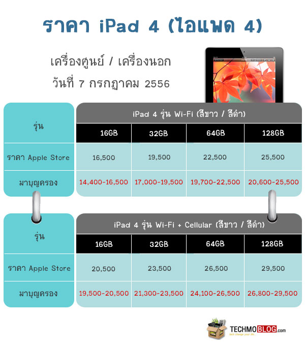 iPad 4 (ไอแพด 4) เปิดจำหน่ายในไทยอย่างเป็นทางการแล้ว บน Apple Online Store Thailand ประเทศไทย และ iStudio ครับ ซึ่ง อย่างที่คาดไว้ก็คือ ราคา iPad 4 (ไอแพด 4) เท่ากับราคา The new iPad (iPad 3) ตอนเปิดตัวนั่นเอง ส่วน iPad 3 ได้มีการปรับราคาลงแล้วเช่นกัน นอกจากนี้ iPad 4 เครื่องหิ้ว มาบุญครอง ก็มีจำหน่ายเป็นที่เรียบร้อยแล้วครับ ทั้งรุ่น Wi-Fi และ Wi-Fi + Cellular มาดูราคา iPad 4 (ราคา ไอแพด 4) อัพเดทประจำวันนี้กันครับ