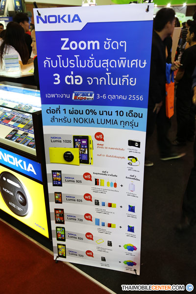 เรามาต่อที่สมาร์ทโฟน ตระกูล Nokia Lumia กันบ้างครับ ซึ่งภายในบูท Nokia ก็มีมือถือ สมาร์ทโฟน มากมายเลยทีเดียว เช่น Lumia 1020, Lumia 925 และ Lumia 920 เป็นต้น โดยทางทีมงานจะนำเสนอราคา และโปรโมชั่น ที่น่าสนใจในบูท Nokia มาให้ท่านผู้อ่านได้่ชมกันครับ
