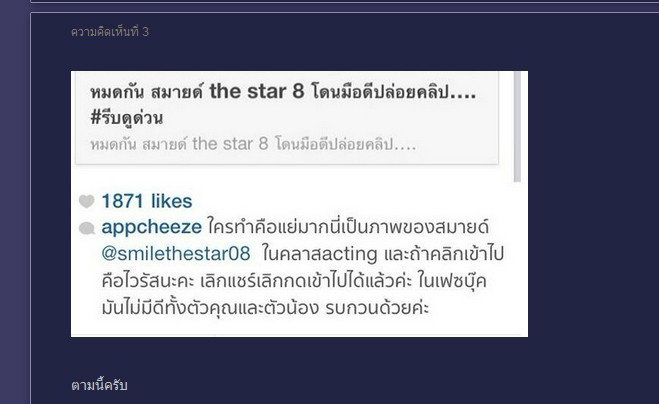ห้าม!!!!!!!!!! คลิกนะครับเพราะมันเป็นไวรัส เพราะตอนนี้นั้นทาง @appcheeze ได้ออกมาโพสแจกแจงรายละเอียดแล้วครับว่า ใครทำคือแย่มากนี่เป็นภาพของสมายด์ในคลาส acting และคลิกเข้าไปคือไวรัส พร้อมทั้งขอร้องให้เลิกกดเข้าไปดู