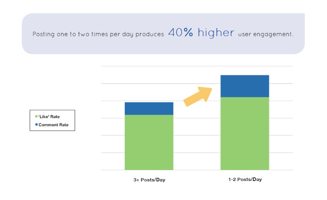 มีการทำวิจัยชิ้นหนึ่งของ Buddy Media บริษัทวิจัยด้านสื่อดิจิทัล บอกว่าจำนวนที่โพสเนื้อหาต่อวันบน Facebook จำนวนเท่าไหร่ดี โดยโฟกัสไปที่การเปรียบเทียบจำนวน 2 และ 3 เนื้อหาต่อวัน ว่าอย่างไหนมีจำนวนการมีส่วนร่วม (Enegagement Rate) มากกว่า ผลปรากฏว่า การโพสเนื้อหาจำนวน 2 ครั้งต่อวัน ทำให้การมีส่วนร่วม Like Share Comment มีผลตอบรับมากกว่า การโพสเนื้อหา 3 ครั้งต่อวัน ตามกราฟครับ
