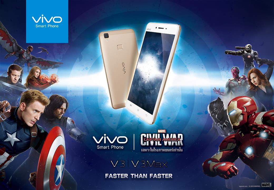 Vivo Smartphone ร่วมกับ Captain America: Civil War เปิดตัวมือถือรุ่นใหม่ล่าสุด Vivo V3 และ V3Max เมื่อต้นเดือนเมษายนที่ผ่านมา มือถือ Vivo รุ่น V3 และ V3Max ไม่เพียงคงสุดยอดระบบเสียง Hi-Fi แต่ยังเพิ่มประสิทธิภาพความเร็ว ระบบประมวลผลขนาดใหญ่ ปลดล็อคลายนิ้วมือสุดล้ำ และการชาร์จแบตอย่างรวดเร็ว ให้สมกับที่ว่า “Faster than Faster”