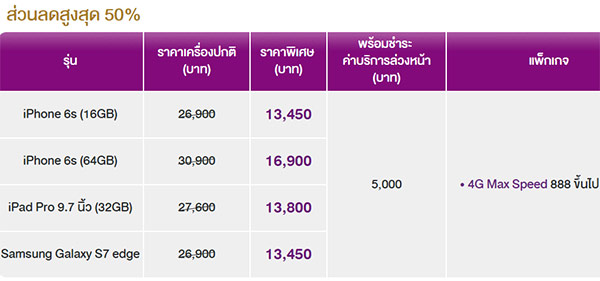 iPhone 6s รุ่นความจุ 16GB ราคา 13,450 บาท (จากราคาปกติ 26,900 บาท) และรุ่นความจุ 64GB ราคา 16,900 บาท (จากราคาปกติ 30,900 บาท)