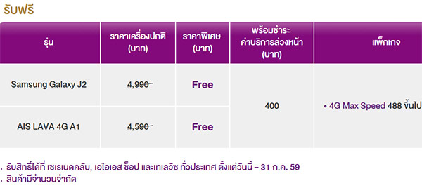 แต่หากท่านไม่ต้องการส่วนลดสมาร์ทโฟนรุ่นเรือธงข้างต้น ก็สามารถเลือกรับสมาร์ทโฟน 4G ฟรีได้ด้วยเช่นกัน เพียงทำการสมัครแพ็กเกจรายเดือน 4G Max Speed 488 บาทขึ้นไป (ได้ รับสิทธิ์ในการใช้งานอินเทอร์เน็ตความเร็วสูงแบบ 3G และ 4G สูงสุดเดือนละ 10GB, พื้นที่ AIS Cloud+ 100GB และรับชมภาพยนตร์ผ่านแอปพลิเคชัน AIS Play ฟรี 4 เรื่อง/สัปดาห์) พร้อมชำระค่าบริการล่วงหน้า 1 เดือน ซึ่งประกอบไปด้วย