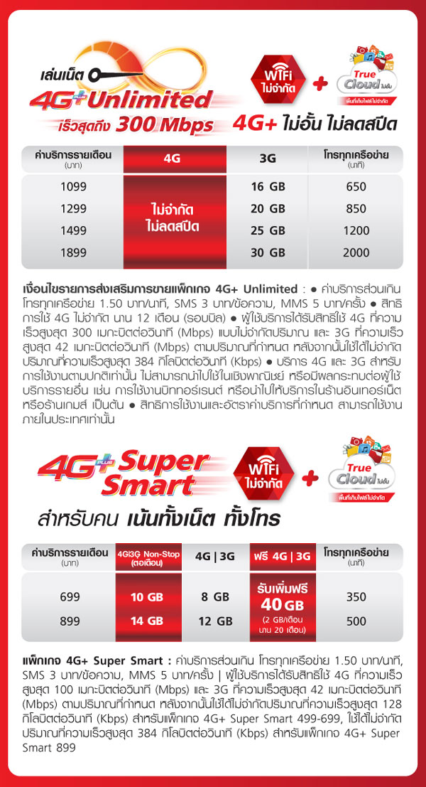 สำหรับรายละเอียดแพ็กเกจ 4G+ Super Smart และ 4G+ Unlimited เป็นดังนี้