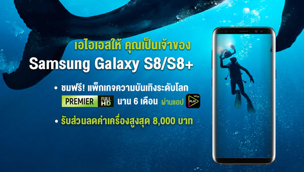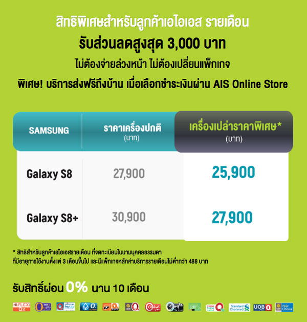และสำหรับลูกค้า AIS รายเดือน ที่มีอายุการใช้งานตั้งแต่ 3 เดือนขึ้นไป และมีแพ็กเกจหลักค่าบริการรายเดือนไม่ต่ำกว่า 488 บาท รับสิทธิ์ซื้อ Samsung Galaxy S8 และ Samsung Galaxy S8+ ในราคาพิเศษ รับส่วนลด 3,000 บาท โดย Samsung Galaxy S8 เหลือ 25,900 บาท ส่วน Samsung Galaxy S8+ เหลือ 27,900 บาท ไม่ต้องจ่ายล่วงหน้า ไม่ต้องเปลี่ยนแพ็กเกจ แถมบริการส่งฟรีถึงบ้าน เมื่อเลือกชำระเงินผ่าน AIS Online Store