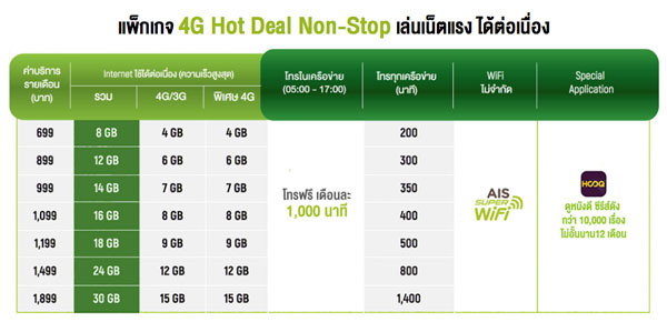 ส่วนรายละเอียดแพ็กเกจ 4G Hot Deal Non-Stop จาก AIS เป็นดังนี้