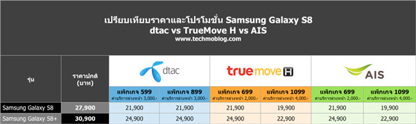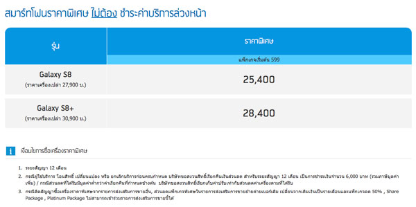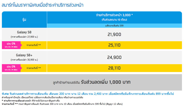 - Samsung Galalaxy S8 เหลือ 21,900 บาท (จากราคาปกติ 27,900 บาท) เมื่อสมัครแพ็กเกจราคา 599 บาทขึ้นไป พร้อมชำระค่าบริการล่วงหน้า 3,000 บาท (ระยะสัญญา 12 เดือน) พร้อมรับส่วนลดค่าบริการ 300 บาท นาน 10 เดือน พร้อมรับหูฟัง Rizz Bluetooth headset ฟรี