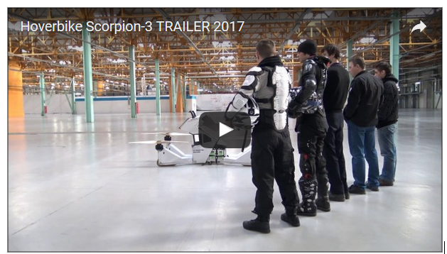 โดรนแท็กซี่ก็มีแล้ว ทำไมจะมีโดรนมอเตอร์ไซค์บ้างไม่ได้? Hoversurf Scorpion-3 (รุ่นทดสอบ) พัฒนาโดยบริษัทสตาร์ทอัพสัญชาติรัสเซีย มี 4 ใบพัด นั่งได้ 1 คน สามารถควบคุมโดยผู้ขับขี่หรือจะควบคุมผ่านรีโมตคอนโทรลแบบโดรนก็ได้ ถ้าจะพูดให้เห็นภาพง่ายๆ มันก็คือมอเตอร์ไซค์ที่ไม่มีล้อ แต่มี 4 ใบพัดและบินได้นั่นเอง แถมยังมีระบบ safety ที่คอยจำกัดความเร็วในการบิน และจำกัดเพดานบินไม่ให้เป็นอันตรายอีกด้วย