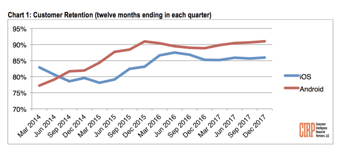มีรายงานผลวิจัยจาก Consumer Intelligence Research Partners (CIRP) ระบุว่าในปี 2017 ที่ผ่านมา ผู้ใช้งานสมาร์ทโฟนระบบปฏิบัติการ Android มีความจงรักภักดีในระบบการใช้งานมากกว่าผู้ใช้ iOS โดยผู้ใช้ Android มีเปอร์เซ็นต์ความจงรักภักดีอยู่ที่ 91% เหนือกว่าผู้ใช้ฝั่ง iOS ที่มีเปอร์เซ็นต์อยู่ที่ 86%