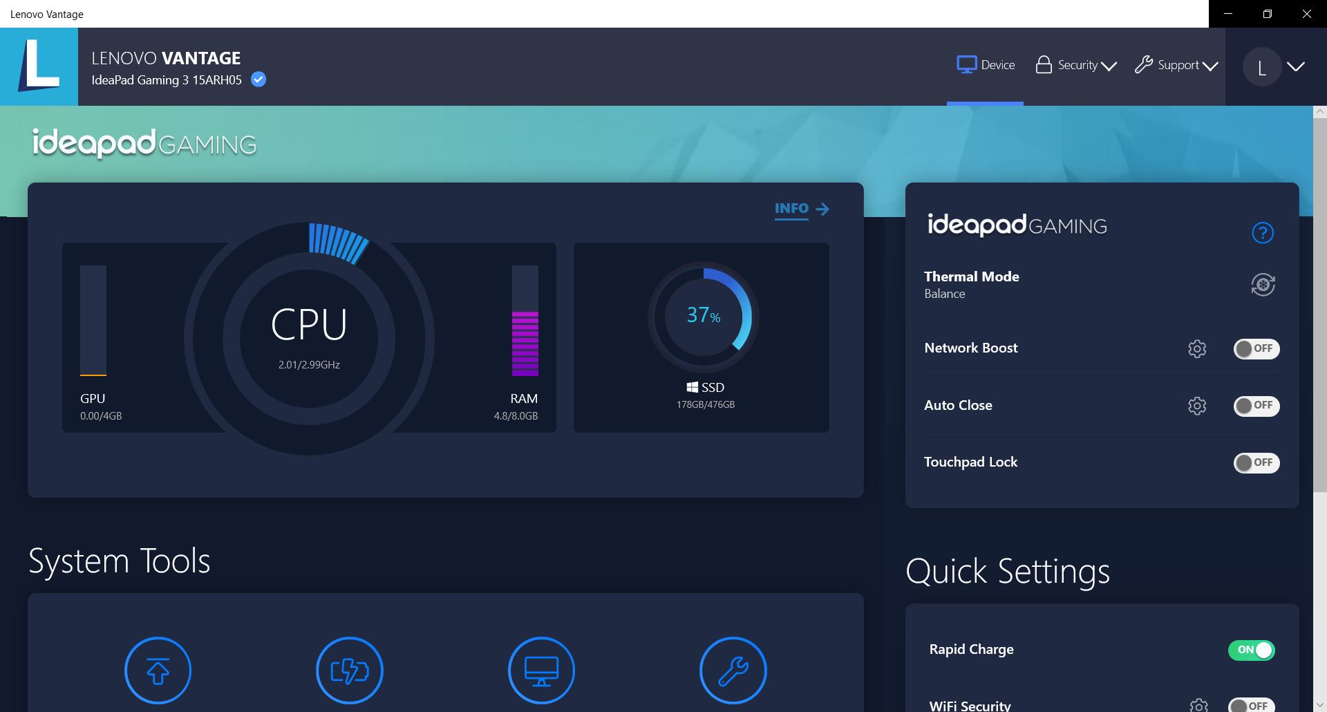 ระบบจัดการตัวเครื่อง Lenovo Vantage ที่สามารถเช็คสภาพเครื่องดูว่าอะไรเสีย แบตเตอรี่ดีอยู่ไหม และ การรับประกัน แต่สำหรับ IdeaPad Gaming จะสามารถควบคุมพัดลมและดูกราฟการแสดงผลการใช้ CPU หรือ RAM ได้ แต่การ์ดจอต้องไปปรับของโปรแกรมจาก NVidia นะครับ