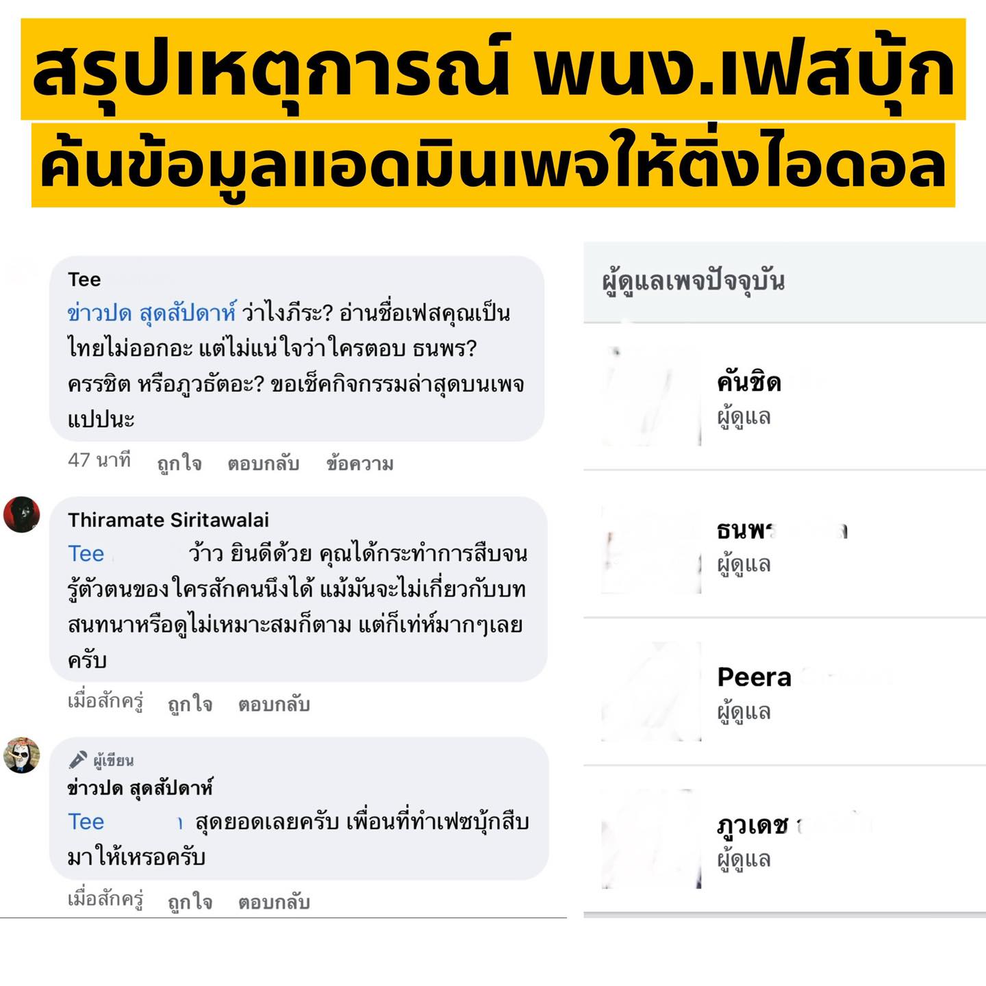 ทั้งนี้ล่าสุด ข่าวปด สุดสัปดาห์ ได้ออกมาเปิดเผยมูลสรุปประเด็น เหตุการณ์ “ติ่ง ให้เพื่อนที่ทำงานเฟซบุ้ก ค้นข้อมูลใครเป็นแอดมินเพจมาเผยแพร่” และข้อมูลดังกล่าวถูกต้องเกือบ 100% ทำให้ต้องตั้งคำถามถึง "นโยบายรักษาข้อมูล" ว่าความปลอดภัยมากแค่ไหน?