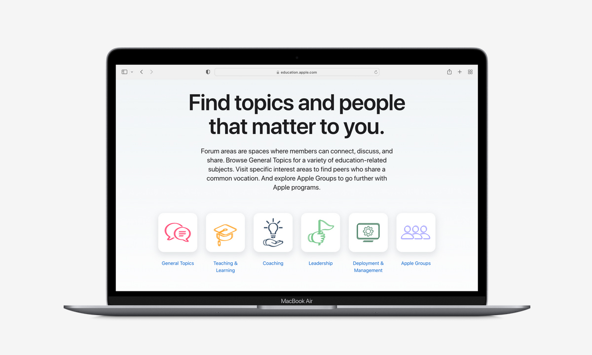 Apple แนะนำ Apple Education Community ศูนย์กลางแห่งการเรียนรู้ระดับมืออาชีพที่ออกแบบมาสำหรับนักการศึกษาที่ใช้เทคโนโลยีของ Apple พบกับแหล่งข้อมูลที่เป็นประโยชน์สำหรับทักษะในทุกๆ ระดับชั้น ตั้งแต่บทเรียนสั้นๆ ไปจนถึงไอเดียที่ช่วยสร้างแรงบันดาลใจ และเติบโตไปพร้อมกับผู้อื่นในพื้นที่แห่งการทำงานร่วมกันนี้ ด้วยการทำความรู้จักกับเพื่อนๆ และผู้เชี่ยวชาญ เพื่อขอคำแนะนำ แบ่งปันเรื่องราว และอีกมากมาย