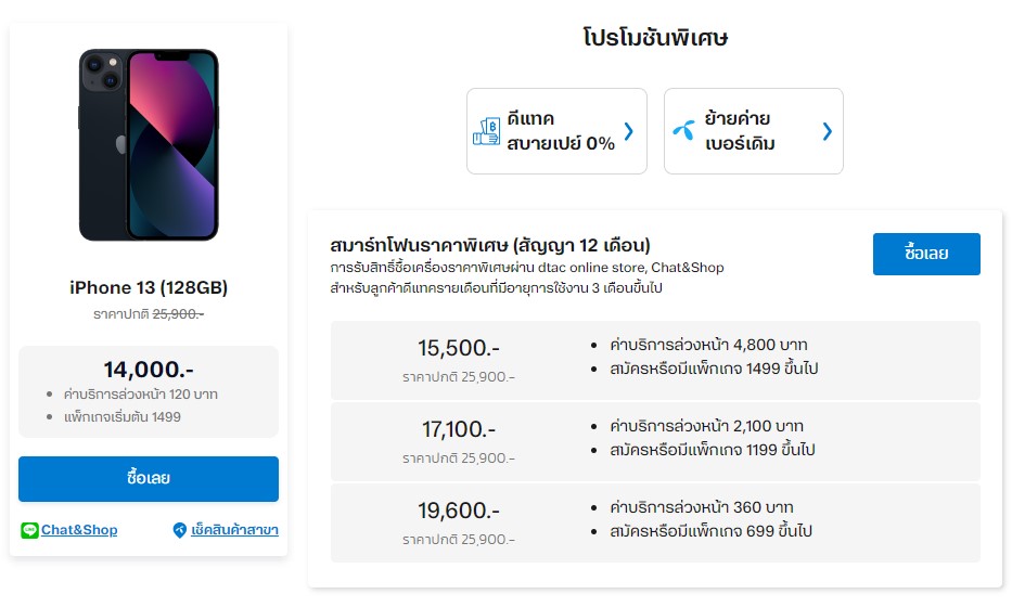 - สมัครหรือเปลี่ยนโปรโมชั่น ราคา 699 บาท พร้อมกับจ่ายค่าบริการ 1,200 บาทสามารถซื้อเครื่องได้ราคา 14,650 บาท