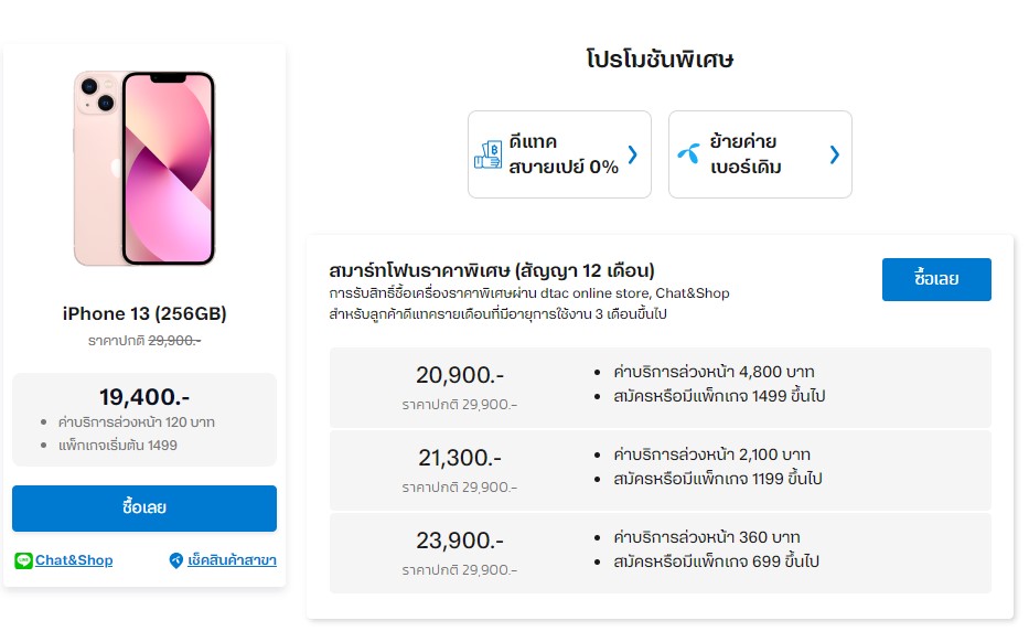 - สมัครหรือเปลี่ยนโปรโมชั่น ราคา 1,099 บาท พร้อมกับจ่ายค่าบริการ 1,200 บาทสามารถซื้อเครื่องได้ราคา 16,800 บาท