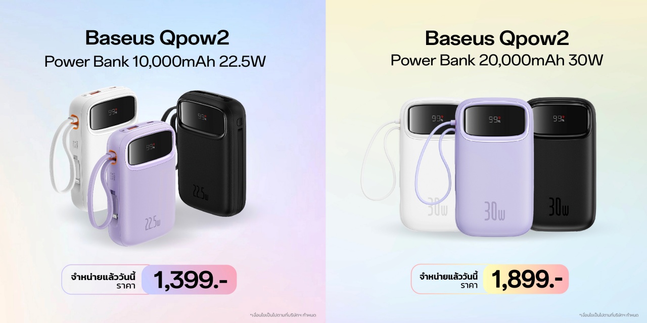 บริษัท ที แอนด์ ซี จำกัด ผู้นำเข้าและจัดจำหน่ายแบรนด์เบซุส ประกาศวางจำหน่าย พาวเวอร์แบงค์รุ่น “ Baseus Qpow2 ” อย่างเป็นทางการในประเทศไทย Baseus Qpow2 มีดีไซน์สุดคิ้วท์ พร้อมหน้าจอดิจิตอลแสดงผลแบตเตอรี่แบบเรียลไทม์ ชาร์จไว มีสายชาร์จในตัว 2 เส้น ชาร์จอุปกรณ์พร้อมกันได้ถึง 4 เครื่อง พร้อมความจุ 2 ระดับ ได้แก่ Baseus Qpow2 รุ่น 10,000mAh (ชาร์จเร็ว 22.5W) ราคา 1,399 บาท และ Baseus Qpow2 รุ่น 20,000mAh (ชาร์จเร็ว 30W) ราคา 1,899 บาท พร้อมประกันศูนย์ไทยจัดเต็ม 12 เดือน
