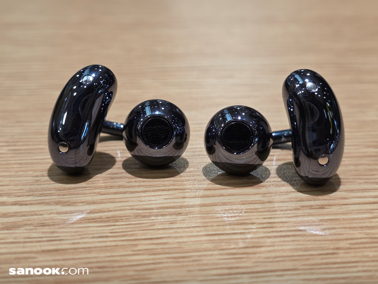 เมื่อเปิดออกมาจะพบกับหูฟังที่มีรูปทรงแบบใส่เสียบด้านข้างที่หูช่วยให้สามารถเกาะกับหูฟได้อย่างดี ส่วนที่เล็กจะเป็นหูฟัง และส่วนที่ใหญ่เป็นแบตเตอรี่ ทั้งนี้หูฟังถ้าใส่ผิดจะไม่สามารถเข้าช่องได้ Driver มีขนาด 12 มิลลิเมตร ทำจากไทเทเนียม ที่พูดเลยว่าแค่นี้ก็บอกคุณสมบัติเสียงว่าดีแล้ว ส่วนไมโครโฟนมีทั้งหมด 4 ตัวทั้งนี้หูฟังรุ่นนี้มีให้เลือก 2 สีคือ ดำ และ ม่วง