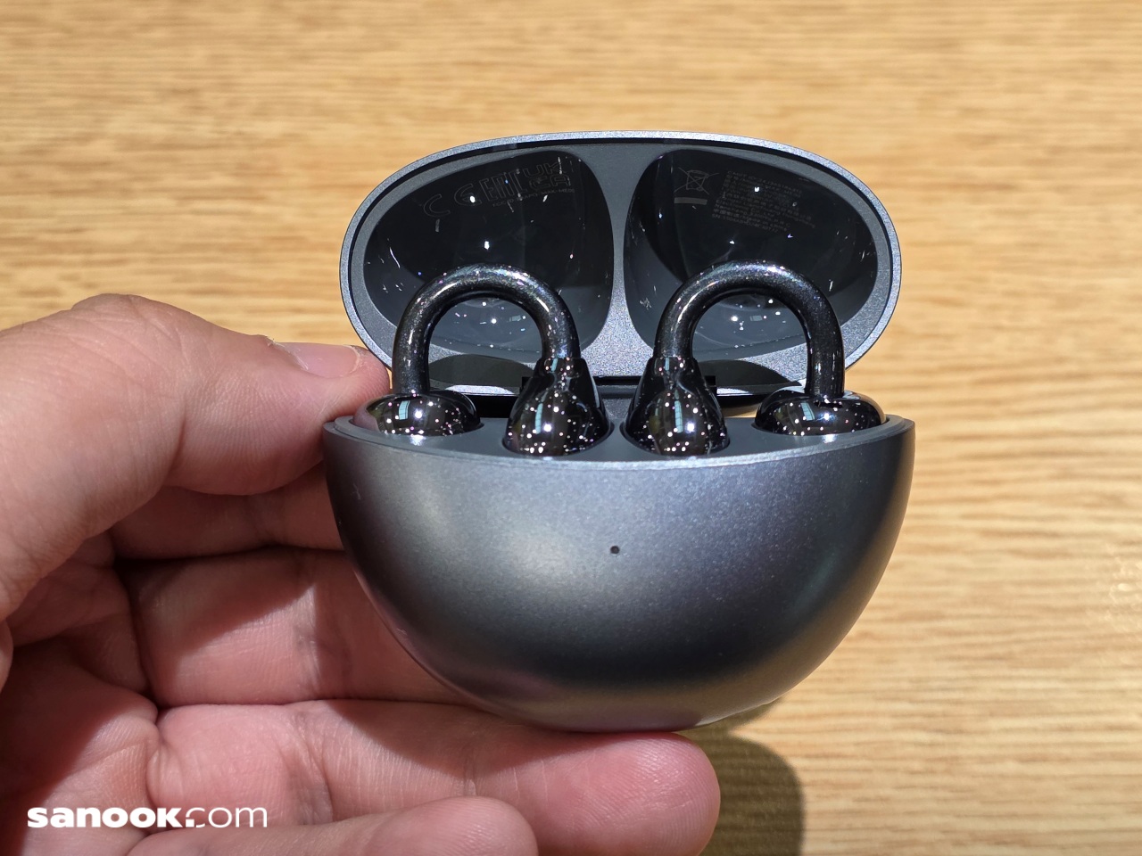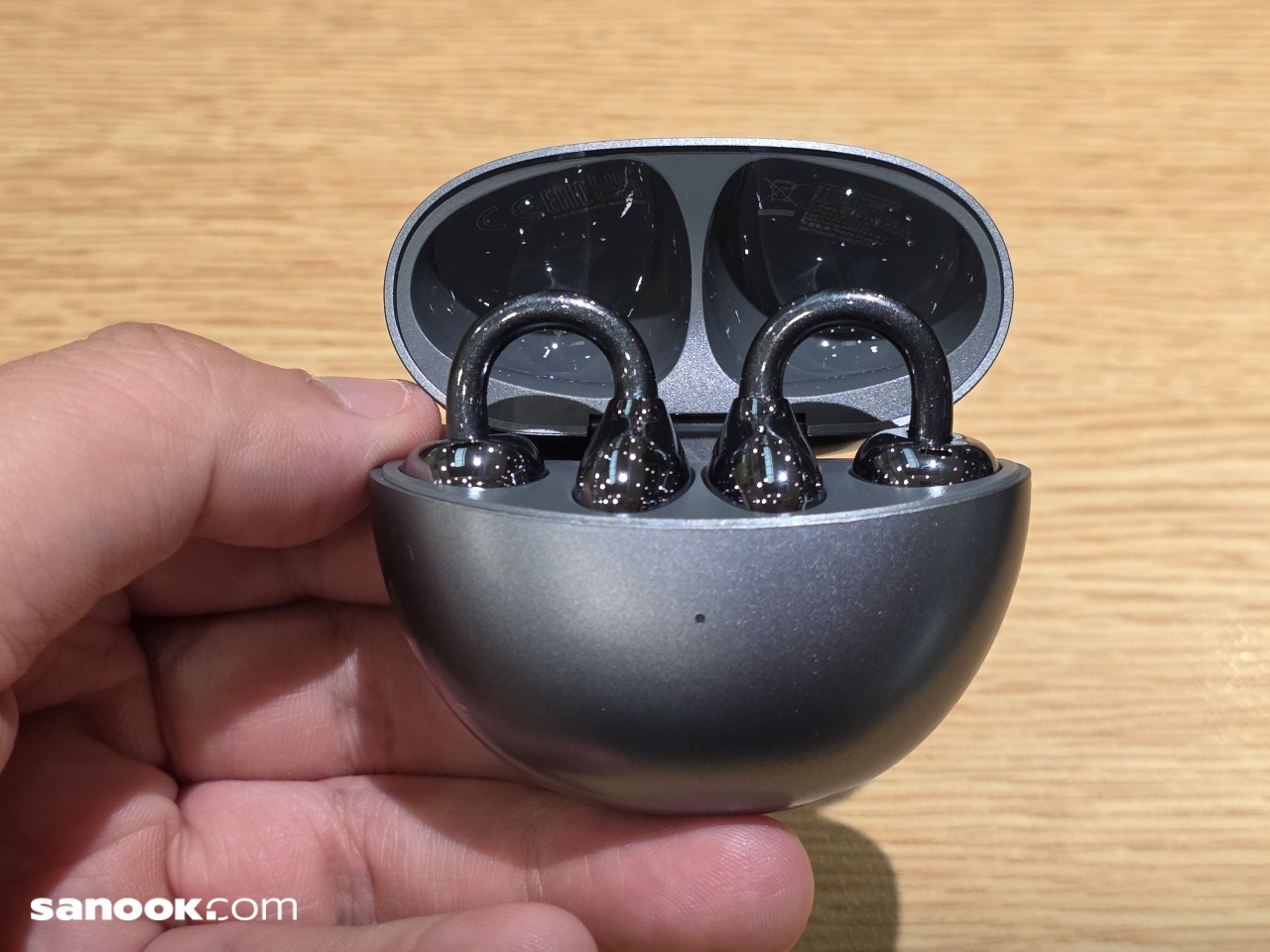 สำหรับสิ่งแรกที่คุณได้เห็นคือ ดีไซน์เคสของหูฟังรุ่นนี้ที่มีลักษณะเป็นเหมือนกับวงกลมแต่ตัดออกเป็นแบบไม่สมมาตร แต่สวยและจับถนัดมืออยู่ ดีไซน์ดูเรียบง่ายแต่จริงๆ แล้วมีองค์ประกอบช่วยคุณใช้งานได้สะดวกเช่น