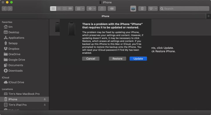 หน้าต่างโต้ตอบจะปรากฏขึ้นเพื่อถามว่าคุณต้องการกู้คืนอุปกรณ์ของคุณหรือไม่ ให้คลิก Restore เพื่อล้างข้อมูลอุปกรณ์และติดตั้ง iOS หรือ iPadOS เวอร์ชันสาธารณะล่าสุด