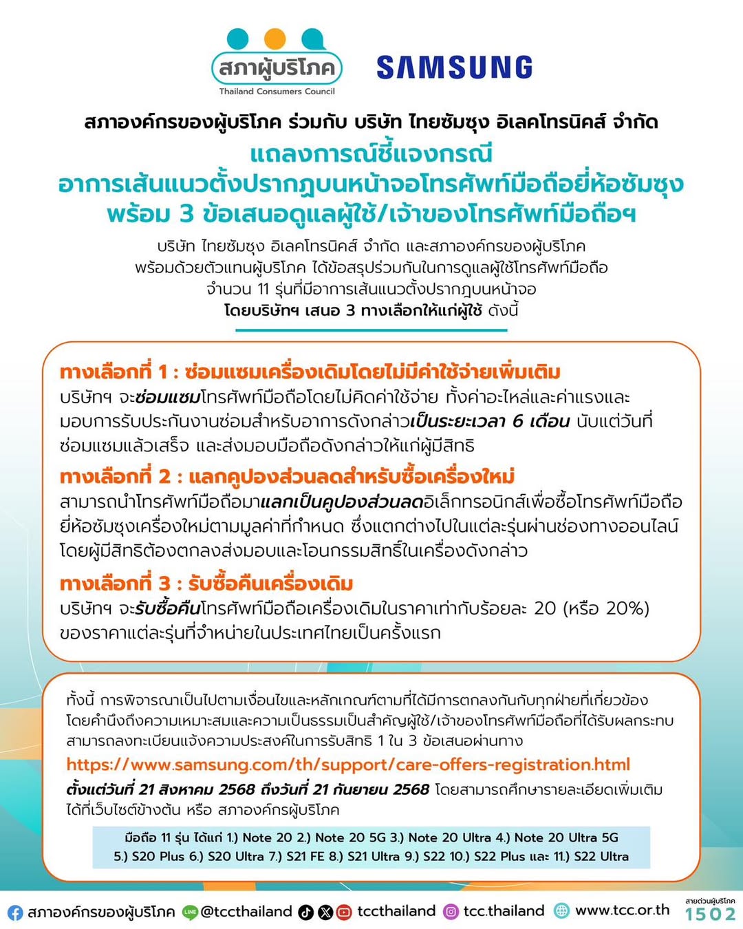 ผู้ใช้เจ้าของโทรศัพท์มือถือที่ได้รับผลกระทบสามารถลงทะเบียนแจ้งความประสงค์ในการรับสิทธิ 1 ใน 3 ข้อเสนอผ่านทาง https://www.samsung.com/th/support/care-offers-registration/ ตั้งแต่วันที่ 21 สิงหาคม 2568 ถึงวันที่ 21 กันยายน 2568 โดยสามารถศึกษารายละเอียดเพิ่มเติมได้ที่เว็บไซต์ข้างต้น หรือ สภาองค์กรของผู้บริโภค
