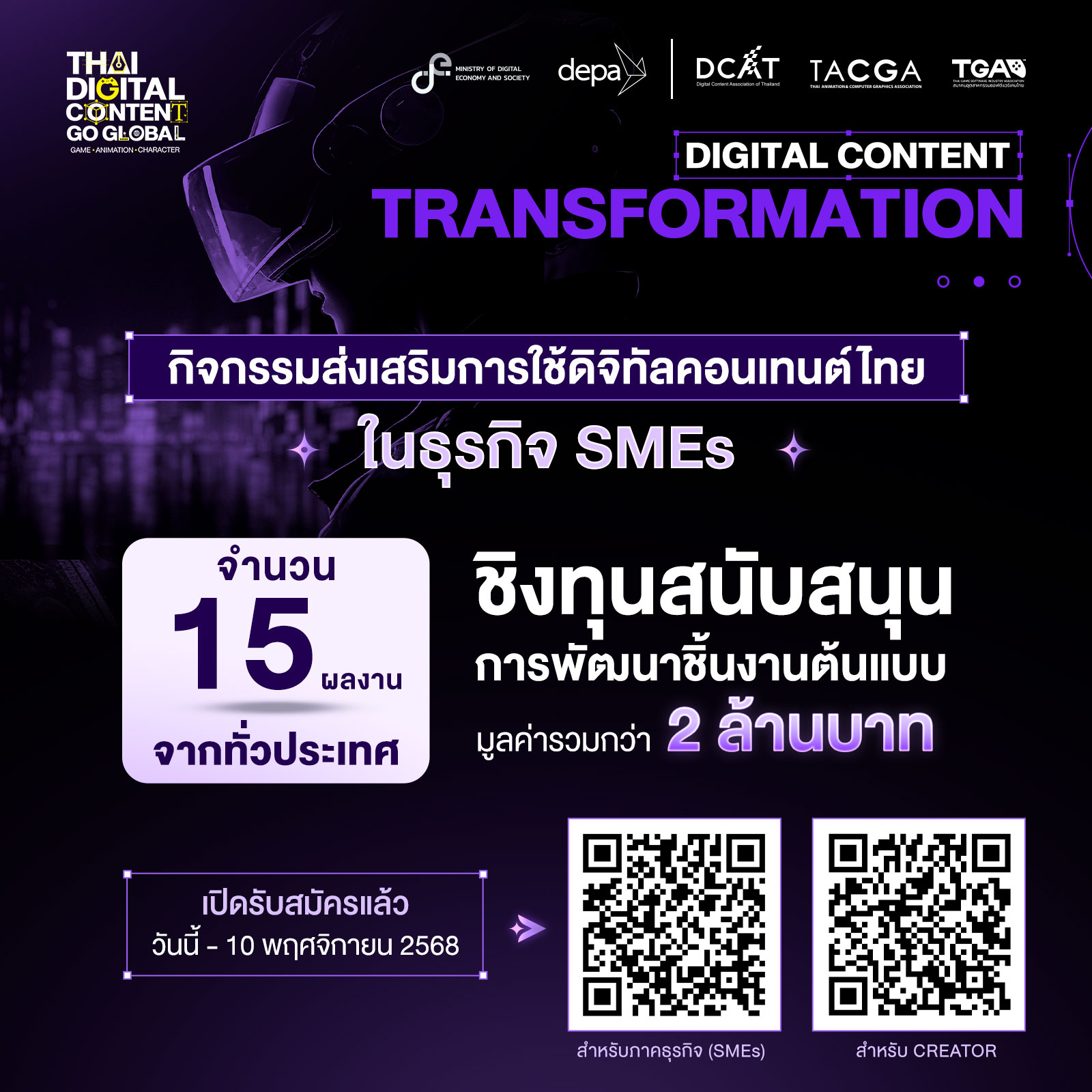 Digital Content Transformation หนึ่งในกิจกรรมสำคัญของโครงการ Thai Digital Content Go Global เตรียมเปิดโอกาสให้ผู้ประกอบการ SMEs จับคู่กับครีเอเตอร์ไทย เจ้าของผลงาน ‘คาแรกเตอร์’ สุดสร้างสรรค์ ชิงทุนสนับสนุนการพัฒนาชิ้นงานต้นแบบ ทุนละ 150,000 บาท ทั้งหมด 15 ทุน