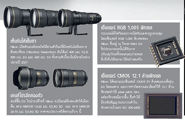 มันคืออะไร ? กล้อง DSLR แบบ full-frame ตัวแรกของ Nikon ที่มีความไวในการถ่ายสูง และมาพร้อมระบบประมวลภาพตัวใหม่ ราคาเท่าไรกันบ้าง? 175,000 บาท (เฉพาะบอดี้) จะหาซื้อได้เมื่อไร ? ติดต่อ www.niksthailand.com หลังจากที่แฟนพันธุ์แท้ของ Nikon ได้รอเวลาที่ทางบริษัท Nikon จะผลิตกล้อง DSLR แบบ full-frame และในที่สุดวันนั้นก็มาถึง กล้อง DSLR ที่มีเซ็นเซอร์แบบ full-frame หรือ FX sensor นั้นหมายความว่า บริเวณที่บันทึกภาพจะมีขนาดใกล้เคียงกับขนาดเฟรมของฟิล์ม 35 มม. ซึ่งหมายความว่าจะไม่มีค่าตัวคุณในการครอปภาพ ดังนั้น เลนส์ขนาด 28 มม. ก็จะทำหน้าที่เป็นเลนส์ 28 มม. จริงๆ แทนที่จะครอปตัดส่วนเฉพาะตรงกลางและลดมุมในรับภาพลง โหมดต่อเนื่องของ Nikon D3 สามารถถ่ายด้วยความเร็ว 9 ภาพ ต่อวินาที และถ่ายได้ถึง 11 ภาพ ต่อวินาที ถ้าลดความละเอียดลงมาที่ 5 ล้านพิกเซลด้วยเลนส์แบบ DX เซ็นเซอร์ CMOS ที่ออกแบบโดย Nikon และเป็นหัวใจของ D3 นั้นมีความละเอียดขนาด 12.1 ล้านพิกเซล และแม้ว่ามันจะมีความละเอียดน้อยกว่า Canon EOS 1Ds Mark III ที่ละเอียดถึง 21 ล้านพิกเซล แต่ก็น่าจะพอเพียงสำหรับความต้องการของช่างภาพระดับโปรส่วนใหญ่ ข้อดีของการมีจำนวนพิกเซลที่น้อยกว่าก็คือพื้นที่ที่มากขึ้นของแต่ละพิกเซลบนตัวเซ็นเซอร์ทำให้แต่ละพิกเซลรับแสงได้มากขึ้น ซึ่งก็หมายความว่าการถ่ายภาพให้สภาพแสงน้อยจะมีประสิทธิภาพดีกว่า Nikon เตรียมรับมือกับชิปประมวลผลแบบ DiGIC ของ Canon ด้วยการสร้างชิปประมวลผลความเร็วสูง ตัวใหม่แล้ว D3 ยังข่มด้วยจุดโฟกัส 51 จุด และ ราคาของ D3 ต่ำกว่า Canon EOS 1Ds Mark III ถึง 2,600 ปอนด์ และจะทำให้ผุ้ใช้ Nikon หลายคนที่กำลังจะเปลี่ยนใจไปใช้ Canon ต้องกลับมาคิดทบทวนใหม่ โดยเราจะทดสอบแบบเจาะลึกให้คุณได้อ่านกัน โดยเร็วที่สุด