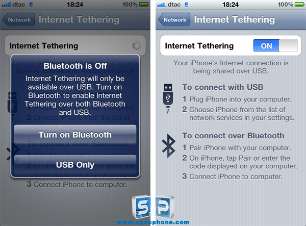 เลือกไปที่ On เพื่อเชื่อมต่อ iPhone เข้ากับโน้ตบุ๊กหรือคอมพิวเตอร์ผ่านทาง Bluetooth หรือ USB ซึ่งถ้าเราเลือก Bluetooth เราก็ต้องทำการจับคู่ (Pairing) ระหว่างโน้ตบุ๊กกับ iPhone ของเรา ส่วนถ้าเป็น USB เราก็เลือกเครือข่ายสัญญาณอินเตอร์เน็ตที่จาก iPhone เท่านั้นเองครับ