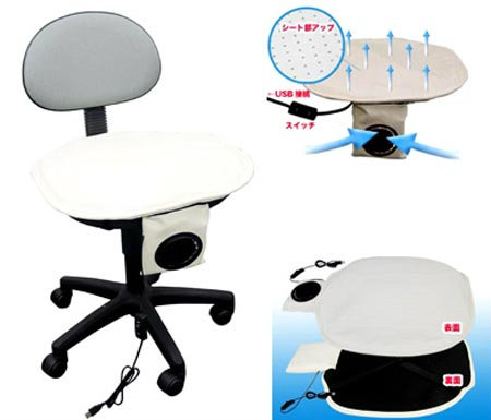 นี่เป็นอีกหนึ่งอุปกรณ์สุดแปลกของญี่ปุ่น เจ้าเครื่องทำความเย็นแบบ USB นี้ ใช้สำหรับให้ความเย็นกับก้นของคุณที่ต้องนั่งติดอยู่กับ เก้าอี้ตลอดเวลา วิธีการทำงานของมันก็แค่เป่าอากาศเย็นไปที่ก้นด้วยพัดลมขนาดเล็กที่ฝังติดกับเครื่อง โดยใช้พลังงานจากคอมพิวเตอร์ ผ่านทางสาย USB