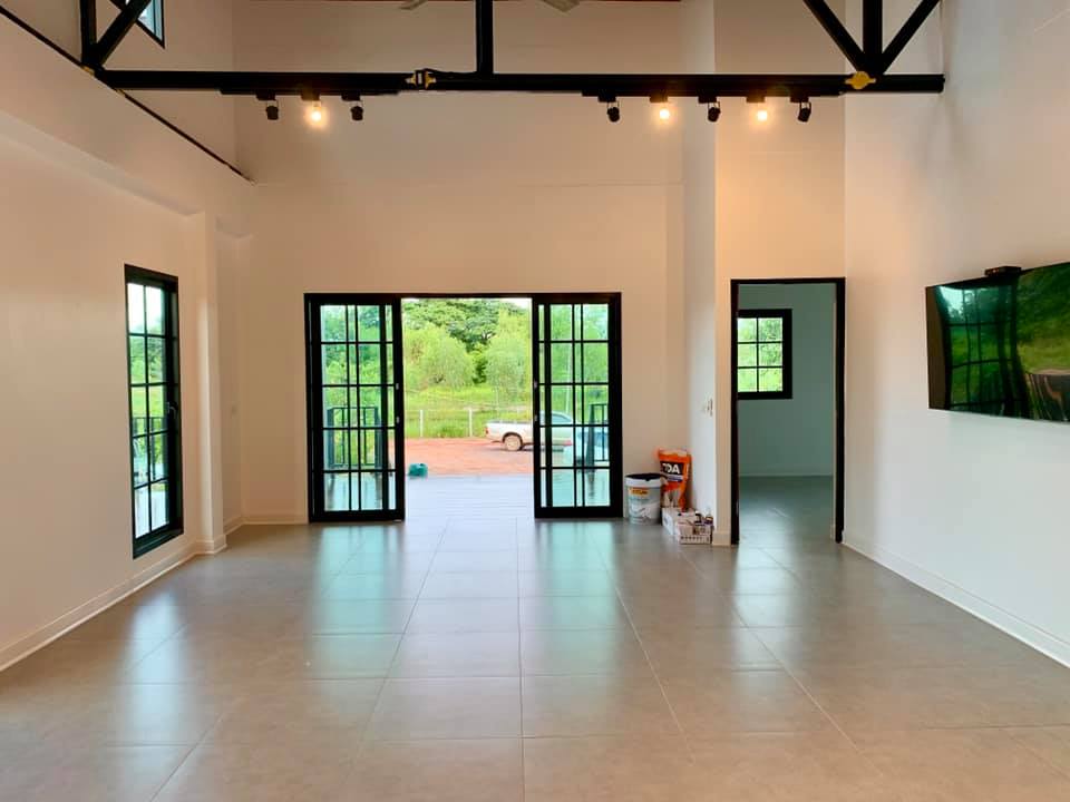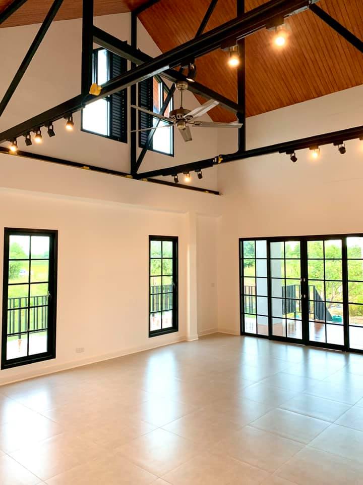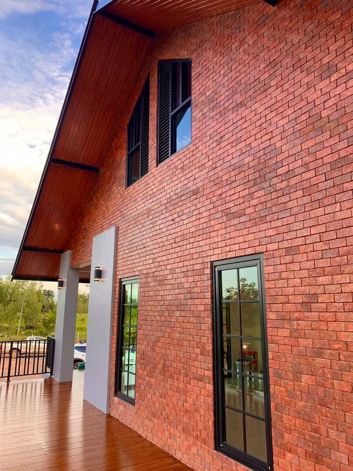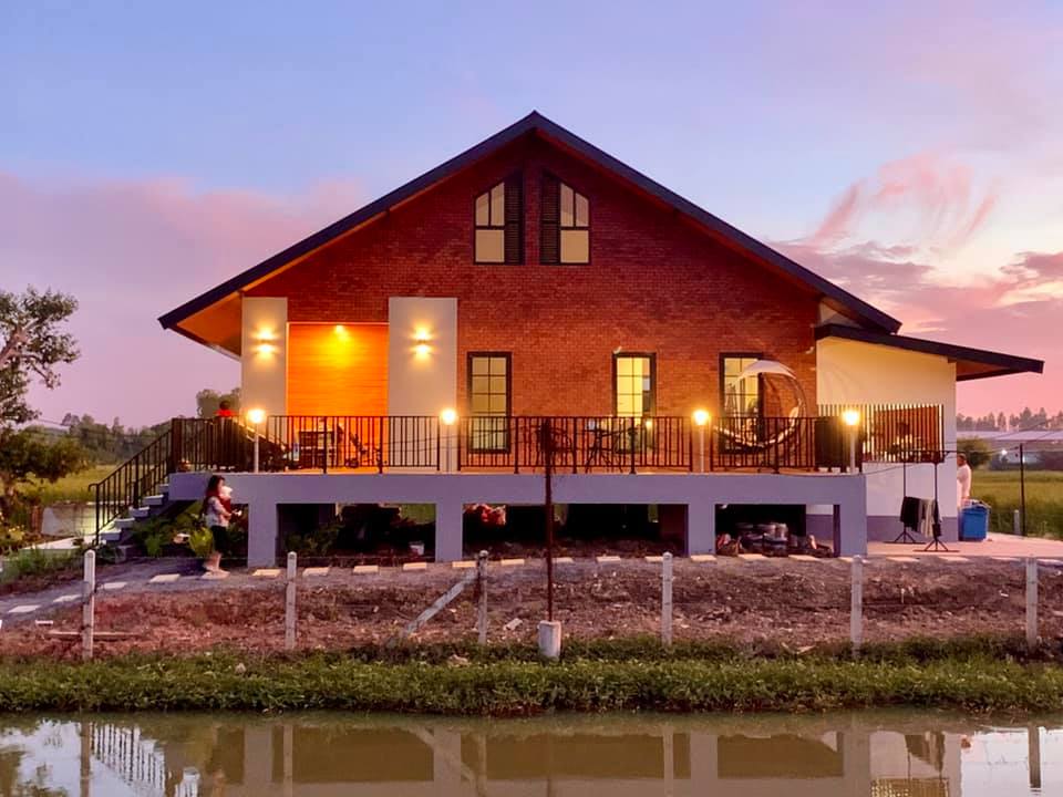 บ้านสวนสไตล์คันทรีโรงนา ตกแต่งด้วยผนังอิฐโชว์แนว พร้อมกับเฉลียงกว้างรับบรรยากาศชายทุ่ง