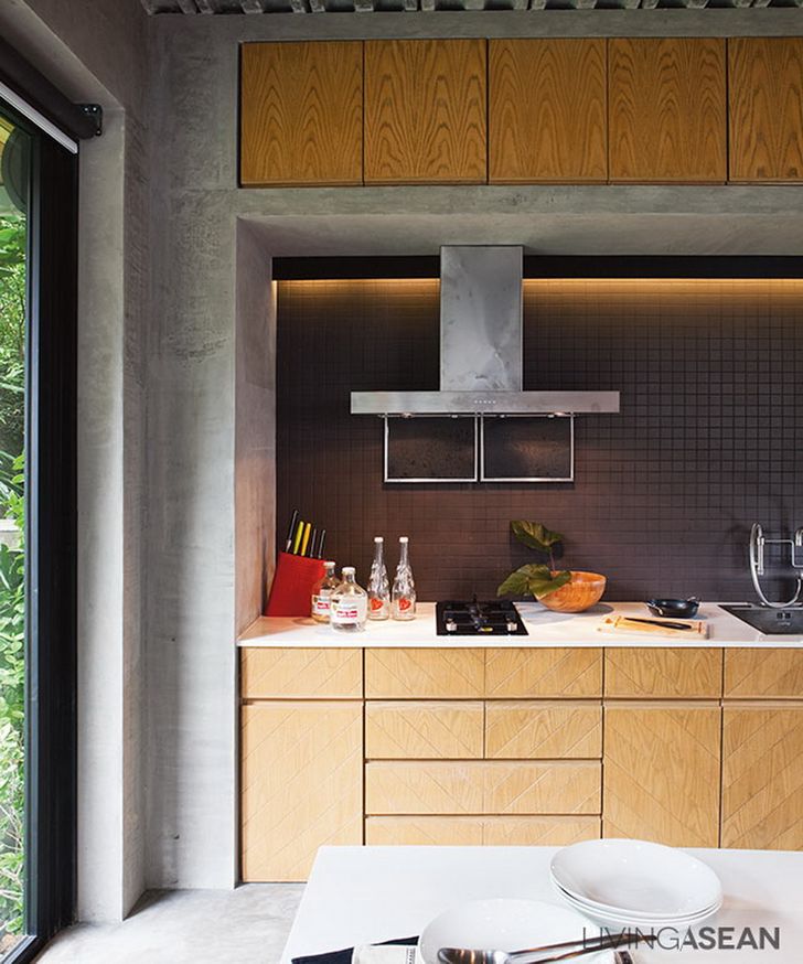 มุมนี้จะให้บรรยากาศที่ดูดิบเท่จากตัวบ้านที่มีผนังปูนเปลือยตลอดแนว โดยมีการออกแบบชายคาเพื่อป้องกันแดดและฝนที่สาดเข้ามายังตัวบ้านอีกด้วย