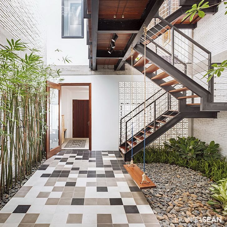 ห้องโถงบริเวณนี้มีลักษณะโปร่งโล่ง สามารถรับเอาแสงแดดจากภายนอกมายังในบ้านได้อย่างเต็มที่ โดยบริเวณนี้ยังมีบันไดสไตล์อินดัสเทรียลที่จะนำเราไปยังบริเวณชั้นสองของบ้าน