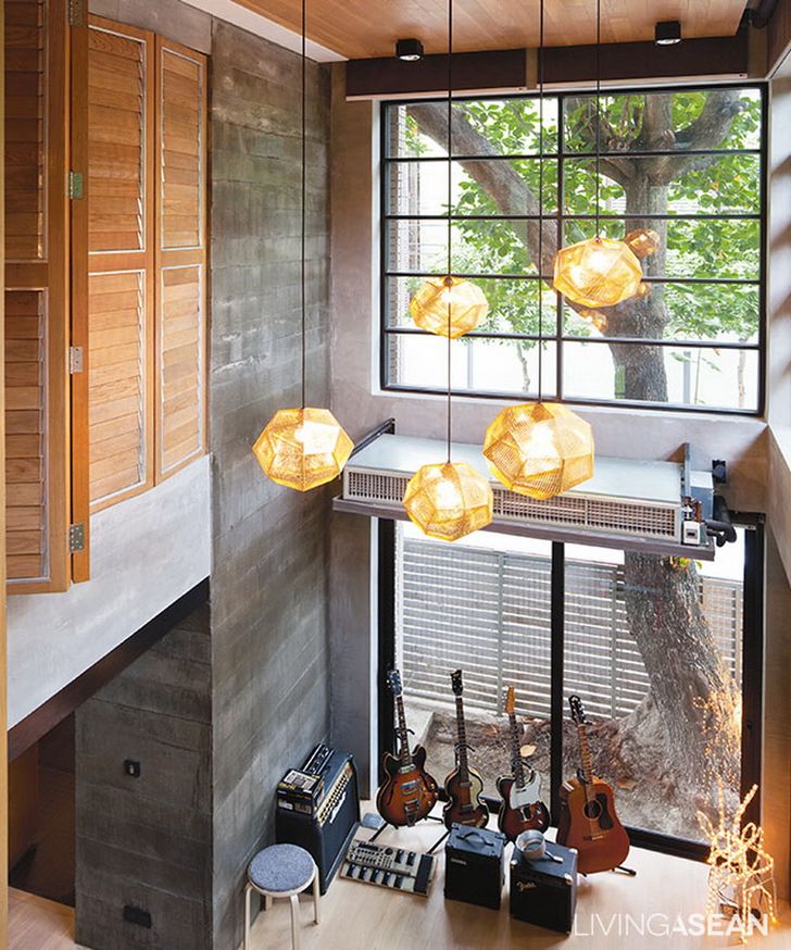 มุมนี้เป็นบริเวณที่ออกแบบเพดานยกสูง มีบรรยากาศที่สว่างและโปร่งสบาย จึงถูกใช้งานเป็นพื้นที่สำหรับซ้อมดนตรีของสมาชิกในบ้าน