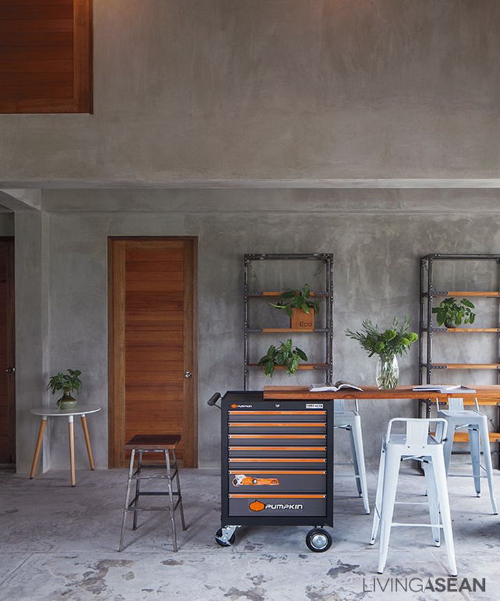 มุมนี้เป็นบริเวณหน้าบ้าน ซึ่งเราสามารถมองเห็นรายละเอียดการออกแบบและตกแต่งอย่างชัดเจน โดยจะมีองค์ประกอบที่ครบถ้วนทั้งปูนเปลือย ไม้และเหล็กที่สะท้อนกลิ่นอายความเป็นอินดัสเทรียลลอฟท์ได้อย่างชัดเจน