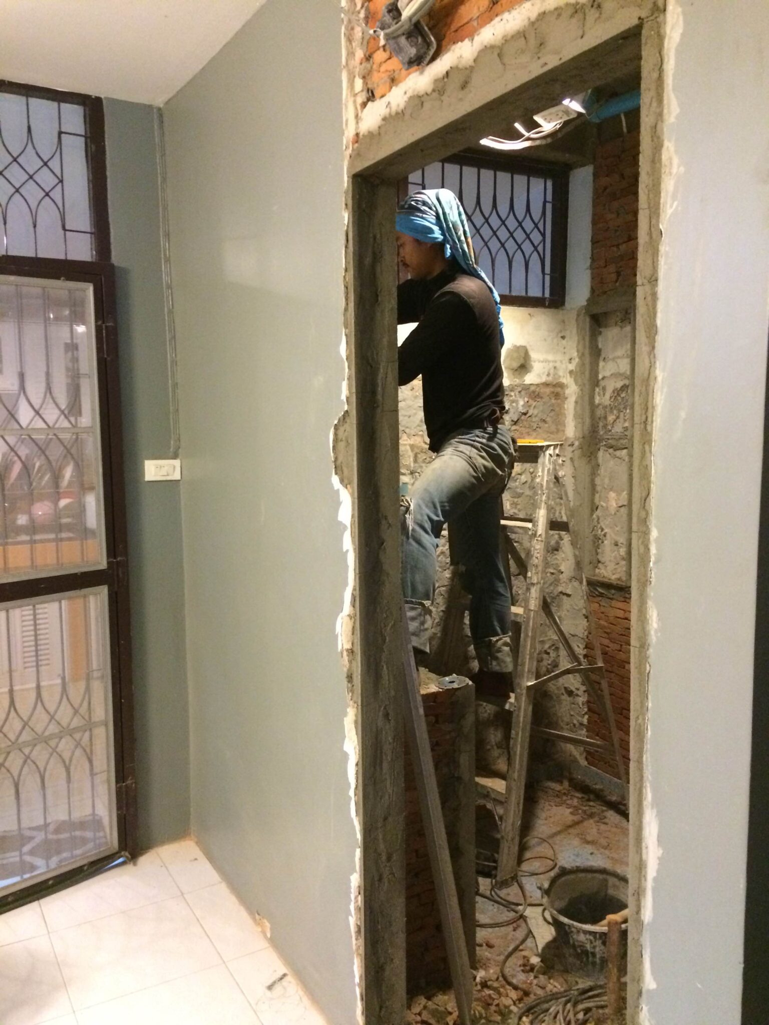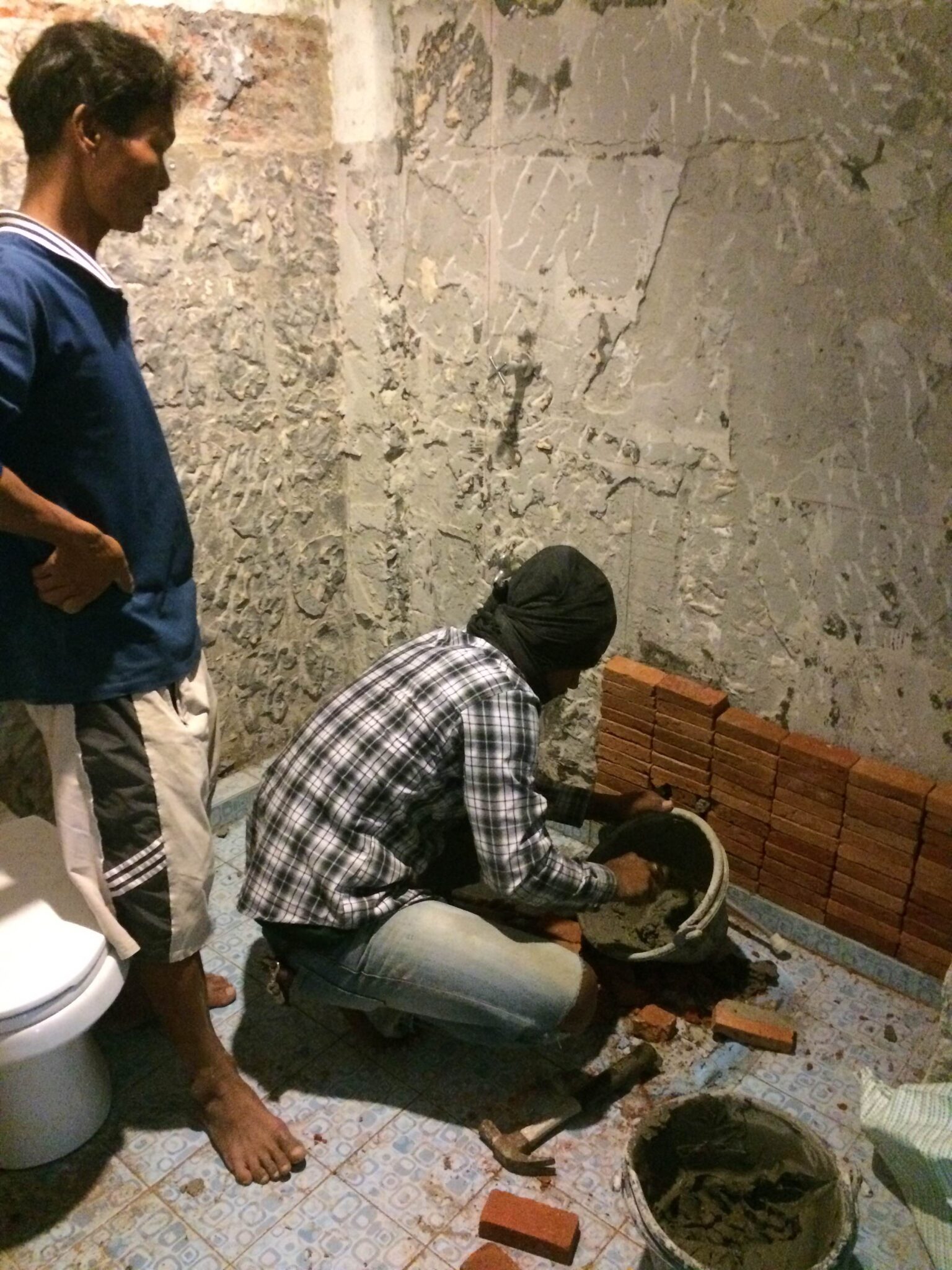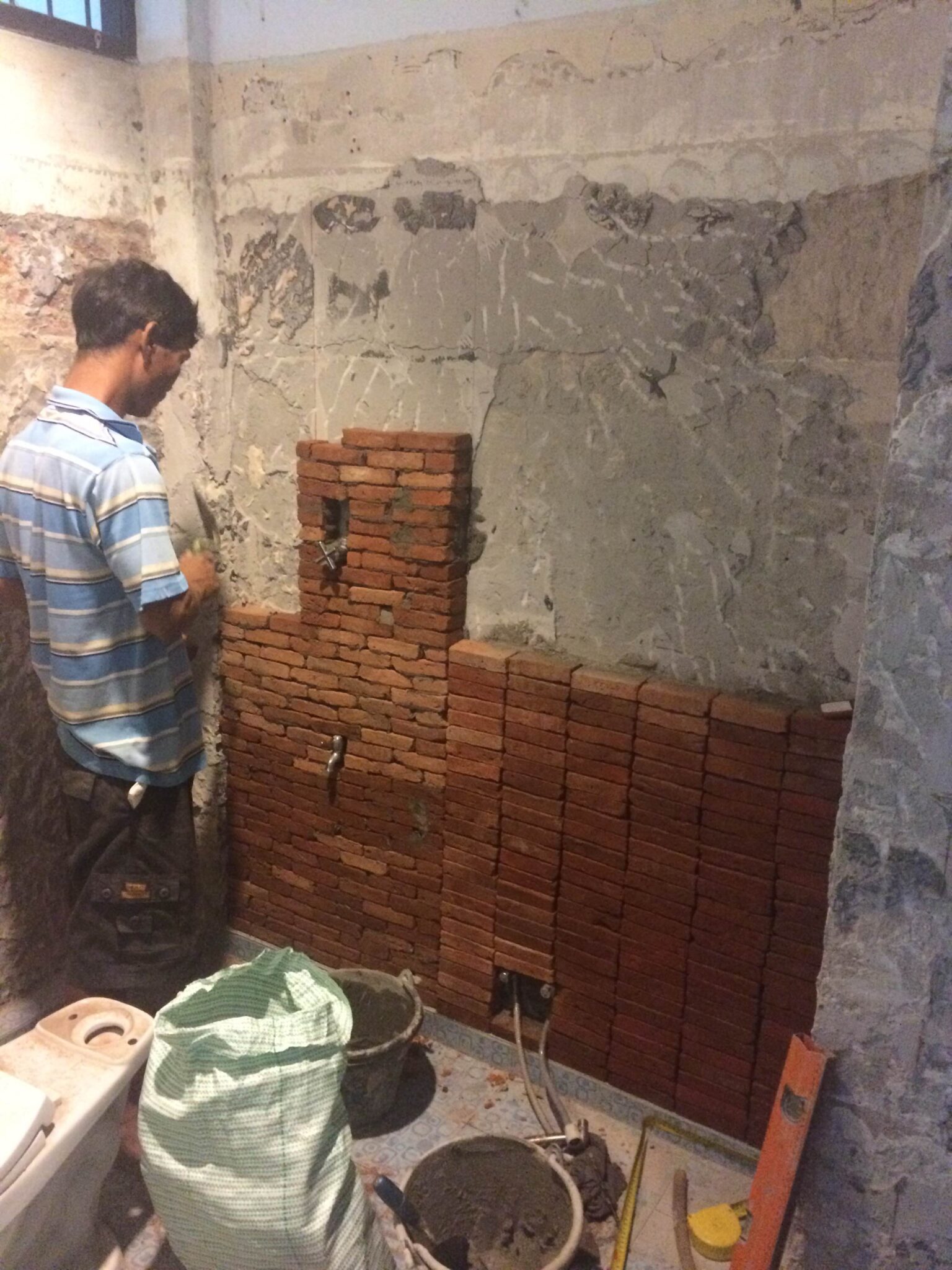 อันดับแรก รื้อครับ รื้อกระเบื้องเก่าออกก่อน ทีมงานเริ่มลุยก่ออิฐ โดยใช้ CONCEPT เดียวกับตัวบ้านที่ผมทำไปเรียบร้อยแล้ว