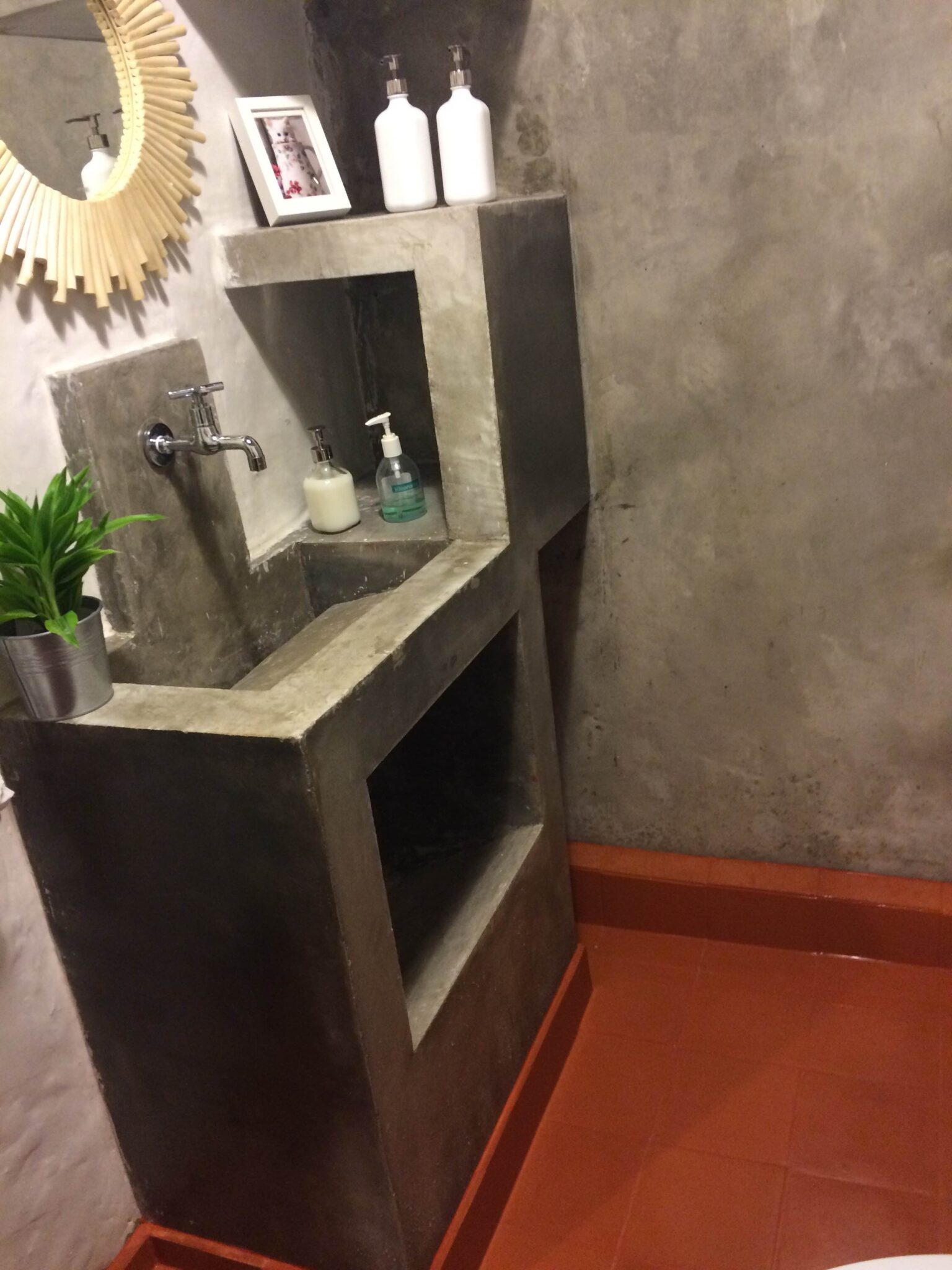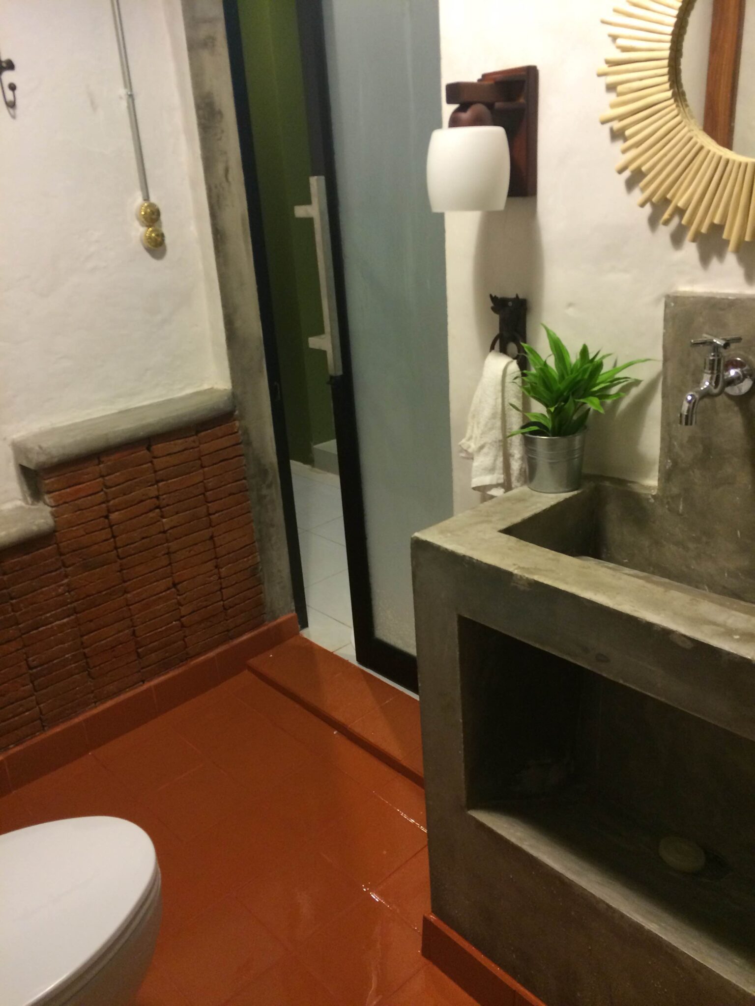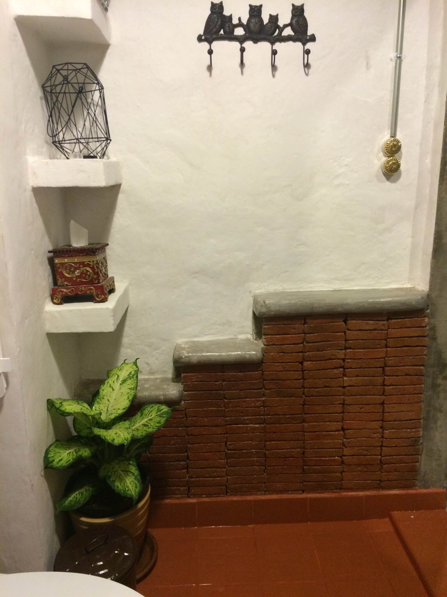 ในห้องน้ำมีผนังที่ก่อเป็นตัวซ่อนท่อน้ำจากชั้นบนลงมา อีกทั้งข้างล่างยังมีบ่าคาน ผมเลยก่ออิฐเสริมตกแต่งให้มีการเล่นระดับภายในให้เกิดความน่าสนใจเพิ่มมากยิ่งขึ้น