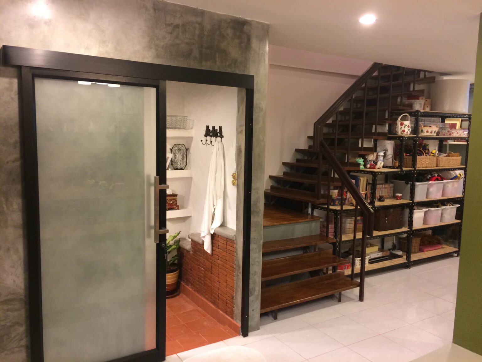 ประตูห้องน้ำเก่าผมก็รื้อออกครับเปลี่ยนเป็นประตูกระจกบานเลื่อนแทน เจาะเสริมทำที่วางของตกแต่งครับ