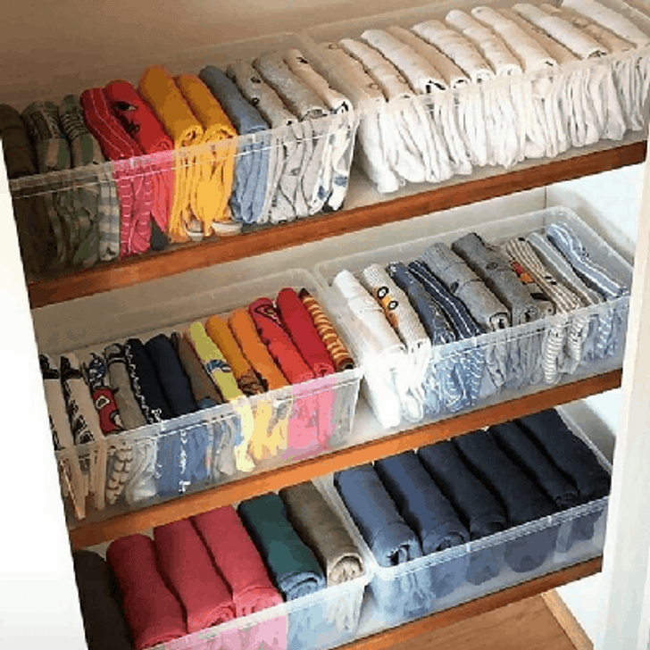 ก่อนอื่นเลย แบ่งเสื้อผ้าแต่ละประเภทแยกออกเป็นกองๆ อันไหนต้องการแขวน อันไหนจะเอาไปพับ ไม่ว่าจะเสื้อ กางเกง ชุดชั้นใน ถุงเท้า อย่าเอาไปกองรวมกัน ไม่อย่างนั้นบอกเลยว่าท้อแท้แน่ๆ เสียความตั้งใจหมด เพราะถ้าเอาเสื้อผ้าทั้งหมดที่มีไปไว้กองเดียวกันล่ะก็คุณจะทำอะไรไม่ถูกเลย (ฮา)