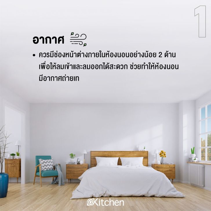 อากาศ ควรมีช่องหน้าต่างภายในห้องนอนอย่างน้อย 2 ด้าน เพื่อให้ลมเข้าและลมออกได้สะดวก ช่วยทำให้ห้องนอนมีอากาศถ่ายเท