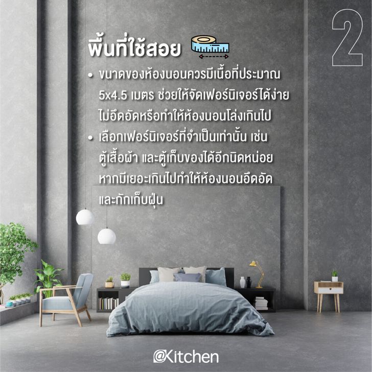 – เลือกเฟอร์นิเจอร์ที่จำเป็นเท่านั้น เช่น ตู้เสื้อผ้า และตู้เก็บของได้อีกนิดหน่อย หากมีเยอะเกินไปทำให้ห้องนอนอึดอัดและกักเก็บฝุ่น