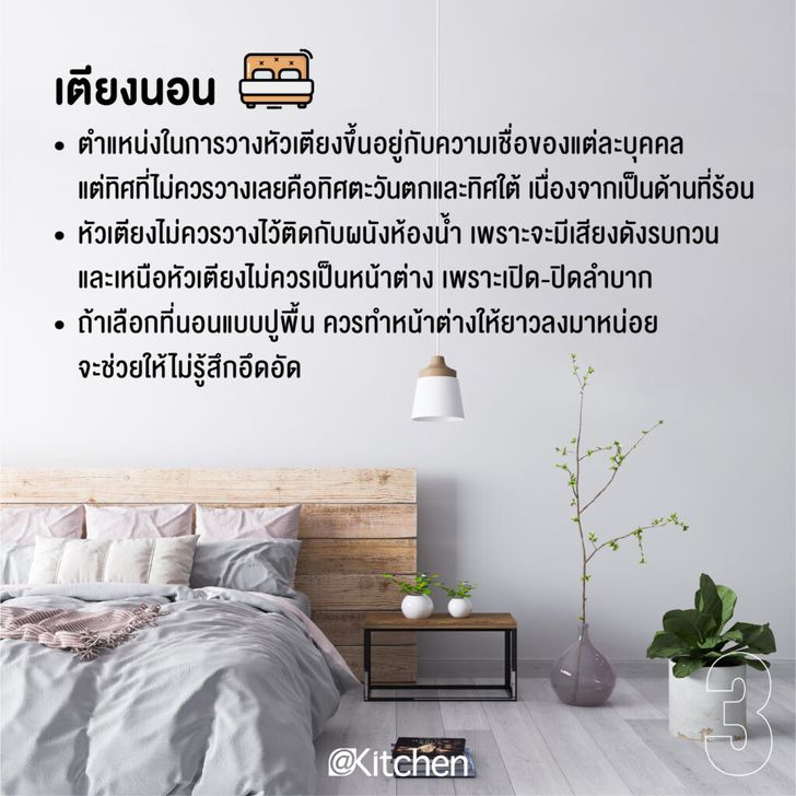 – หัวเตียงไม่ควรวางไว้ติดกับผนังห้องน้ำ เพราะจะมีเสียงดังรบกวน และหัวเตียงไม่ควรเป็นหน้าต่าง เพราะเปิด-ปิดลำบาก
