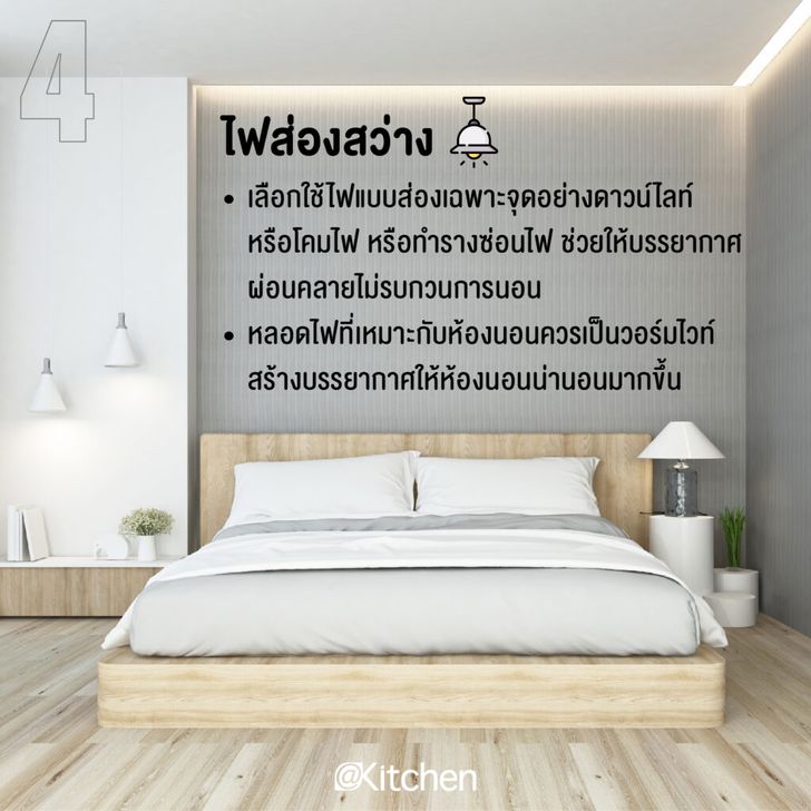 – หลอดไฟที่เหมาะกับห้องนอนควรเป็นวอร์มไวท์ สร้างบรรยากาศให้ห้องนอนน่านอนมากขึ้น